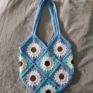 Granny square väska gjord i bomullsgarn💎 Superfin och perfekt på sommaren🌸 Väskan är ca 30 cm i bredd och ca 32 cm i längd. Räknar man med axelremmen är väskan 55 cm i längd totalt. (Normallång axelremm)🌸Frakt ej inräknad i piset🌼