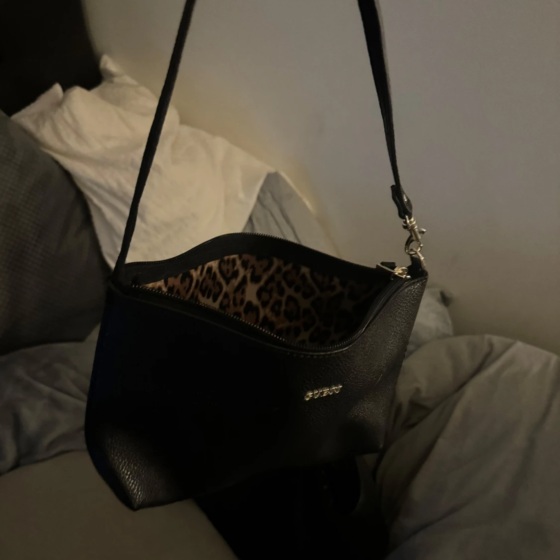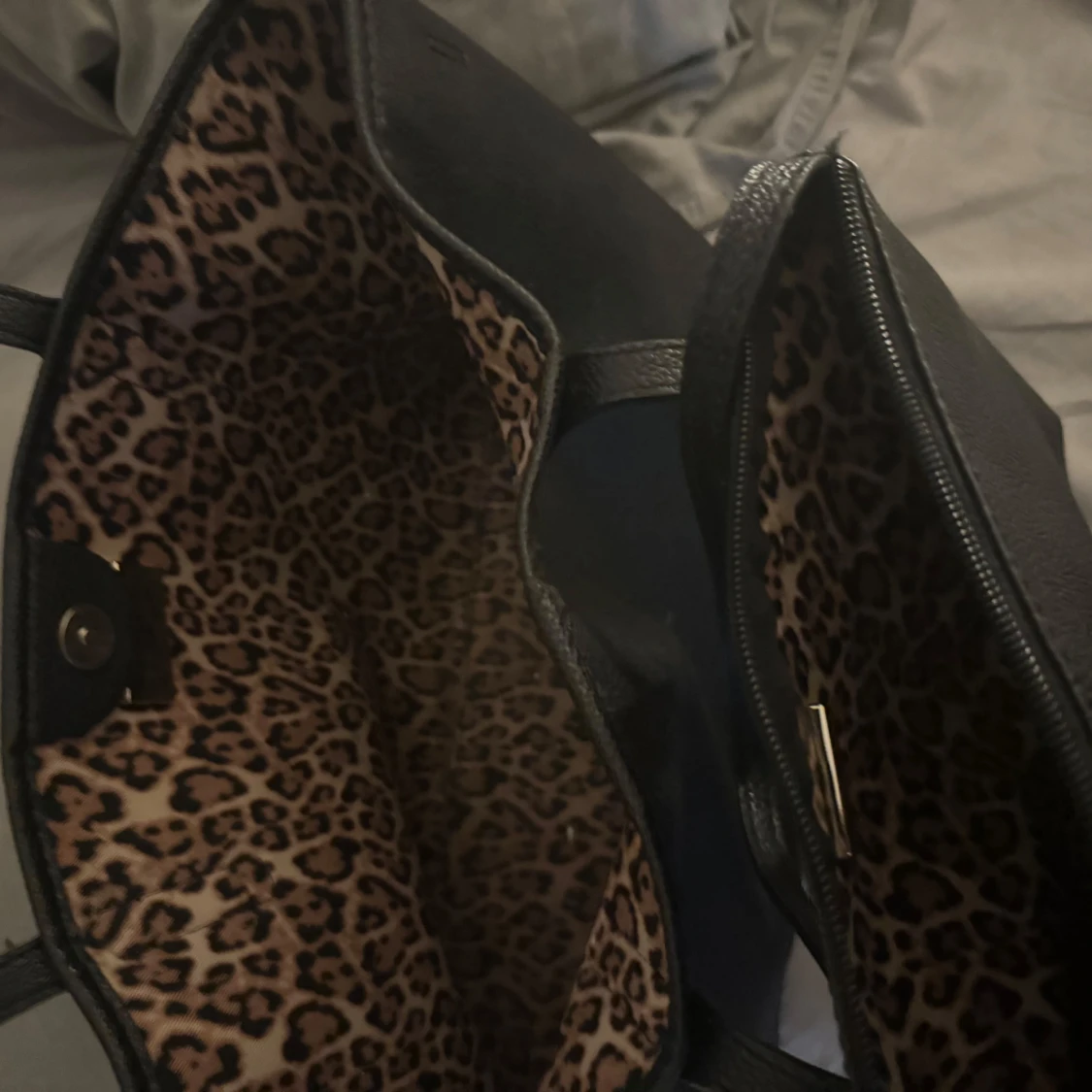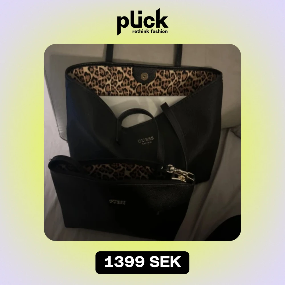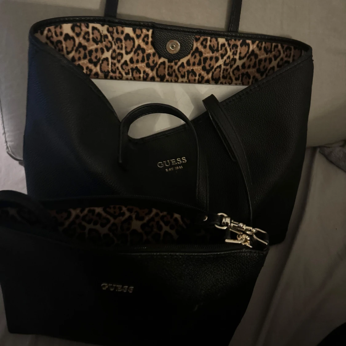 Två stycken guss väskor som kommer tillsammans den lilla kan man knäppa in i den stora så de blir som ett fack i väskan. Endast använt den stora fåtal gånger den lilla är oanvänd. Leopard mönster inuti🐆🐆🐆🐆