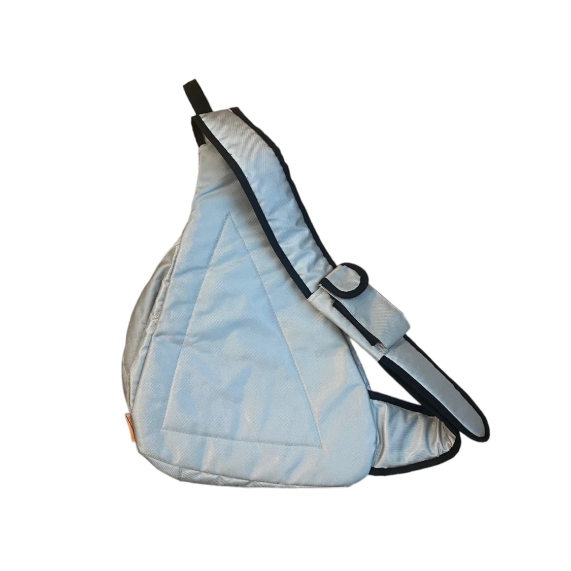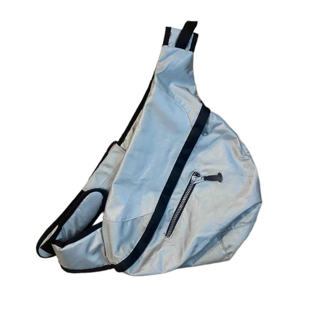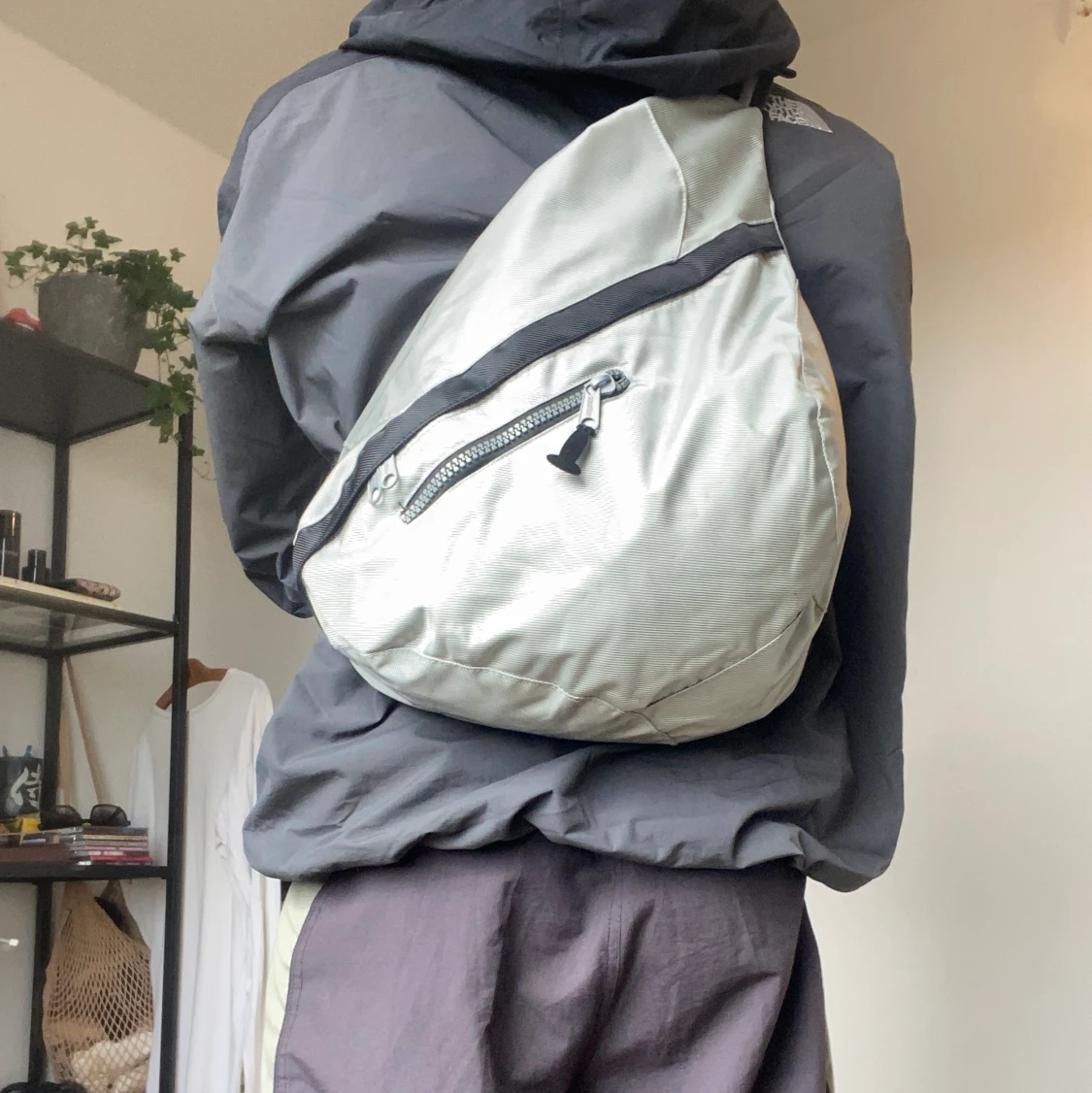 En slingbag i silverfärgad. Vattentätt material. Stor och får plats med mycket. Går att adjusta passformen.
