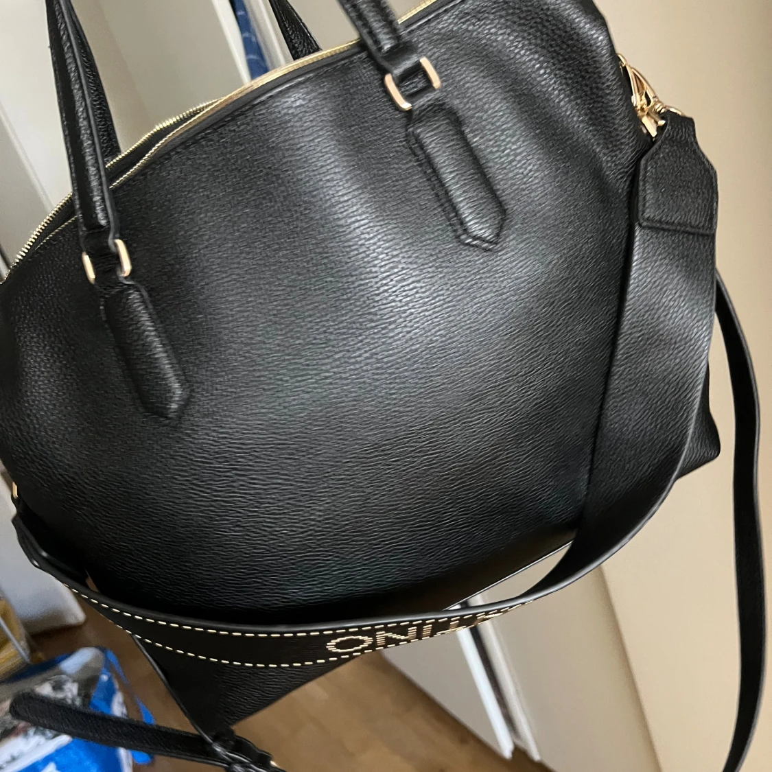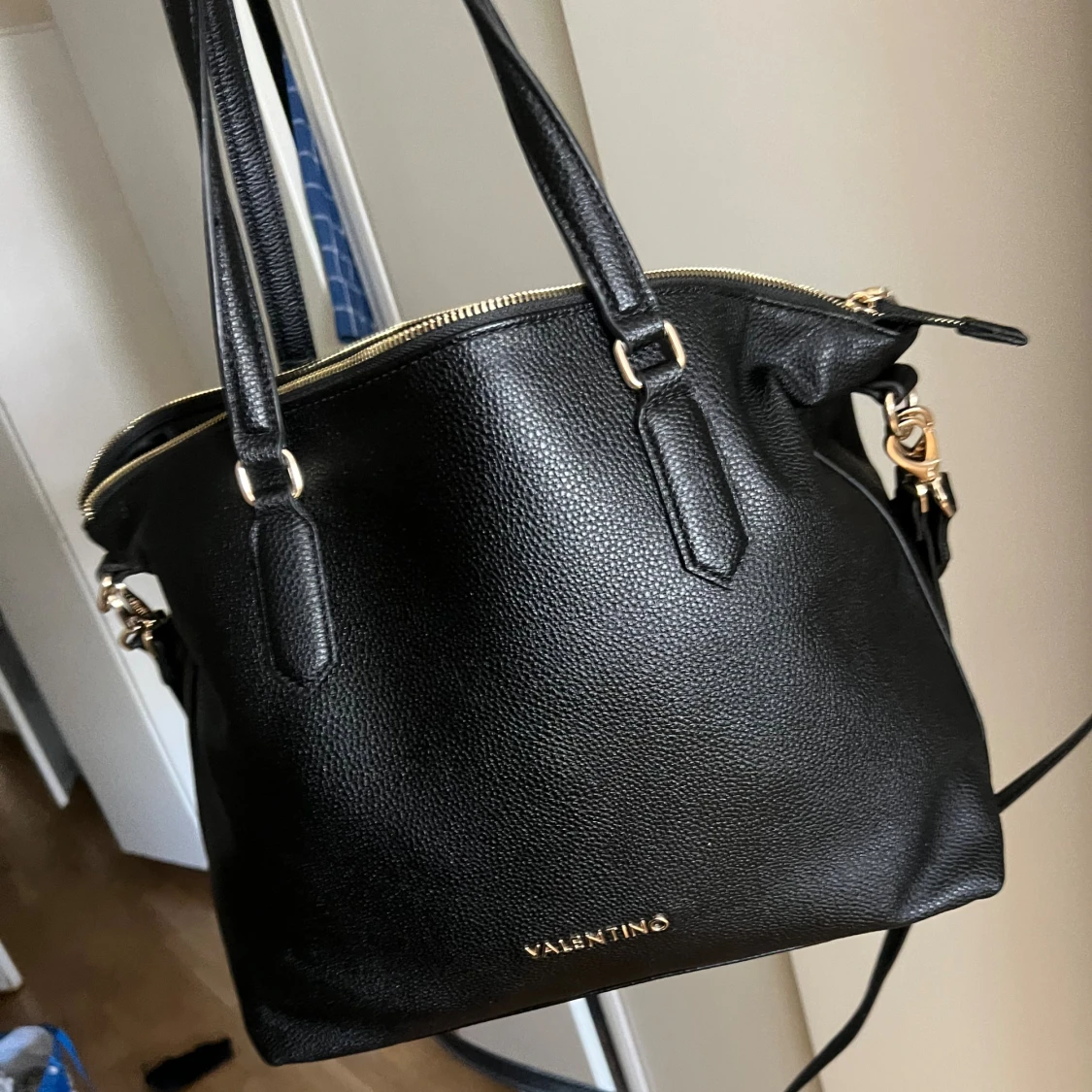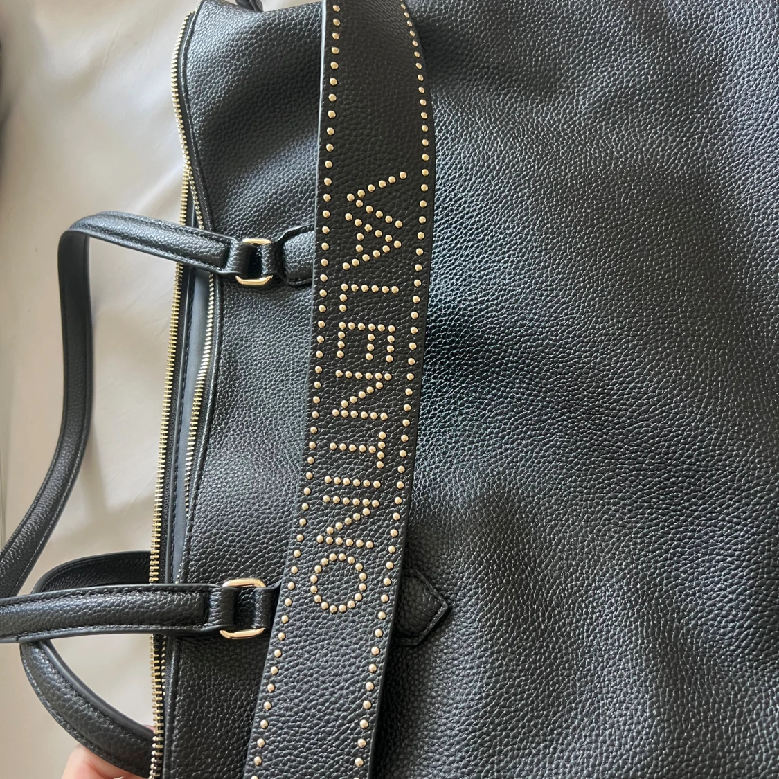 Snygg svart axelväska från Valentino i strukturerat skinn med guldfärgade detaljer och dragkedja. Väskan har både handtag och bred axelrem med Valentino-logga i nitar. Rymligt huvudfack och innerficka för småsaker. Perfekt för dig som vill ha en stilren och trendig väska.