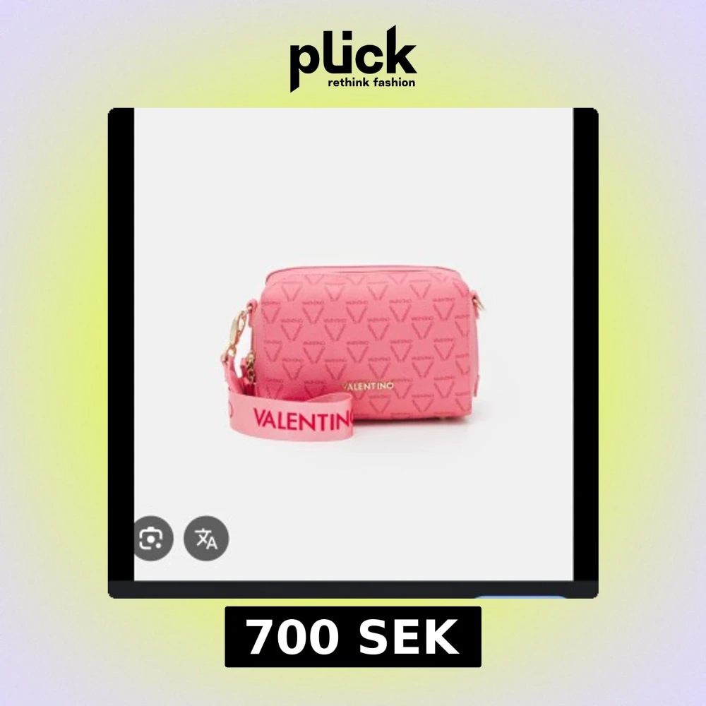 Säljer en snygg rosa axelväska från Valentino med logomönster och bred axelrem med tryckt text. Väskan har guldfärgade metalldetaljer och dragkedja upptill. Perfekt för att lyfta din outfit med en färgklick!