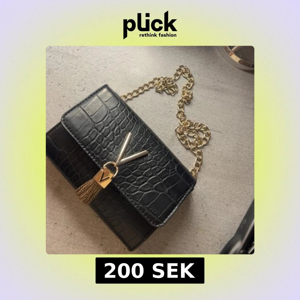 Snygg svart axelväska från Valentino med krokopräglat mönster och guldfärgad kedja. Väskan har ett stort V i metall framtill och dekorativa guldkedjor som detalj. Perfekt storlek för det viktigaste och ger en lyxig känsla till din outfit.💕skriv gärna om ni har fler frågor!!!
