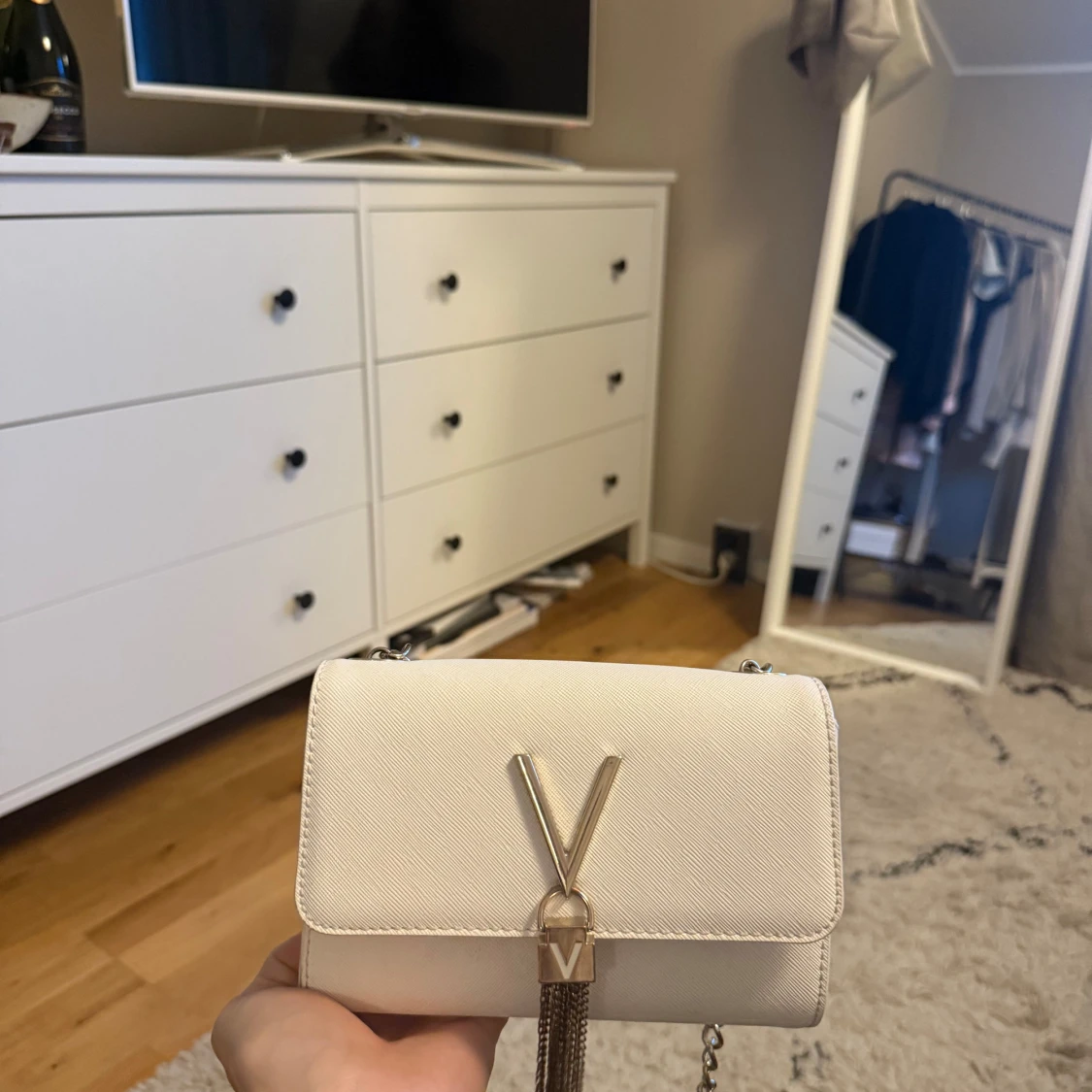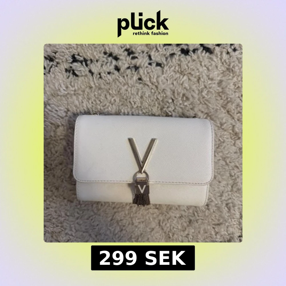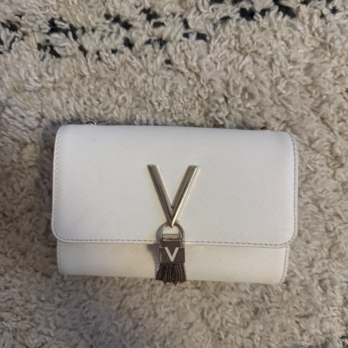 Snygg vit axelväska från Valentino med guldfärgad kedja och stort V i metall på framsidan. Väskan har en stilren, rektangulär form och är gjord i skinn med lätt textur. Dekorativ tofs hänger under loggan för extra detalj. Perfekt för dig som gillar lyxiga accessoarer. Observera att själva ”kedjorna” som hänger under märket har tappat lite av sin färg.