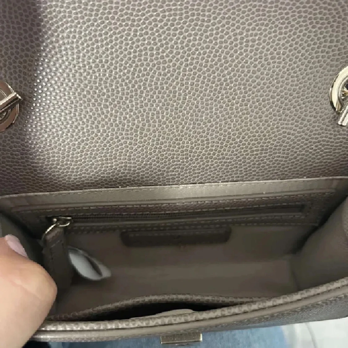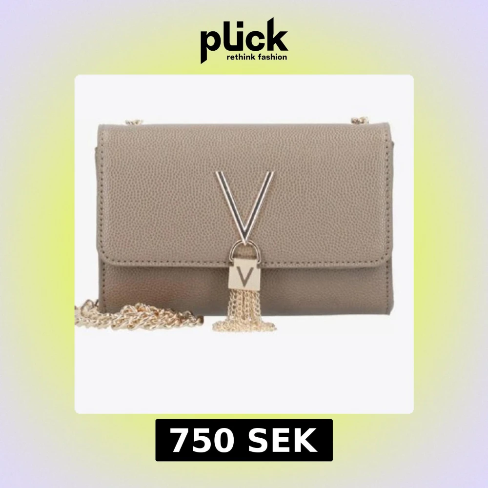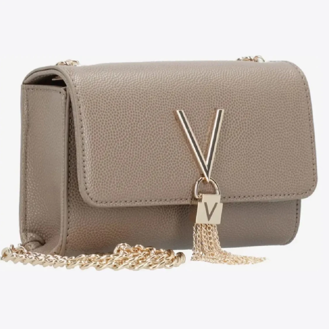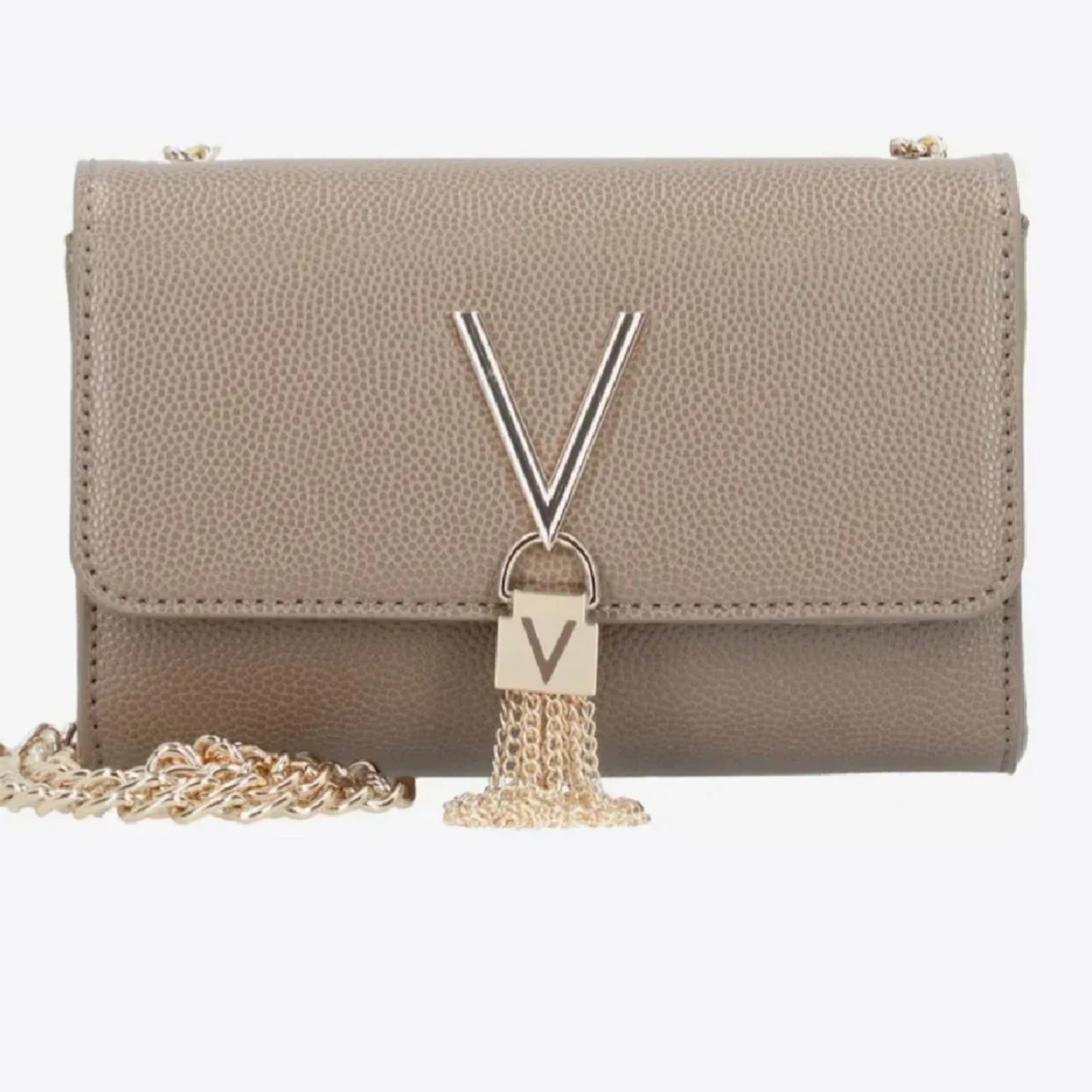 Snygg beige axelväska från Mario Valentino med guldfärgad kedja och V-logga framtill. Väskan har en stilren, rektangulär form och är tillverkad i skinn med struktur. Framtill hänger dekorativa guldfärgade kedjor från loggan. Perfekt storlek för det viktigaste.