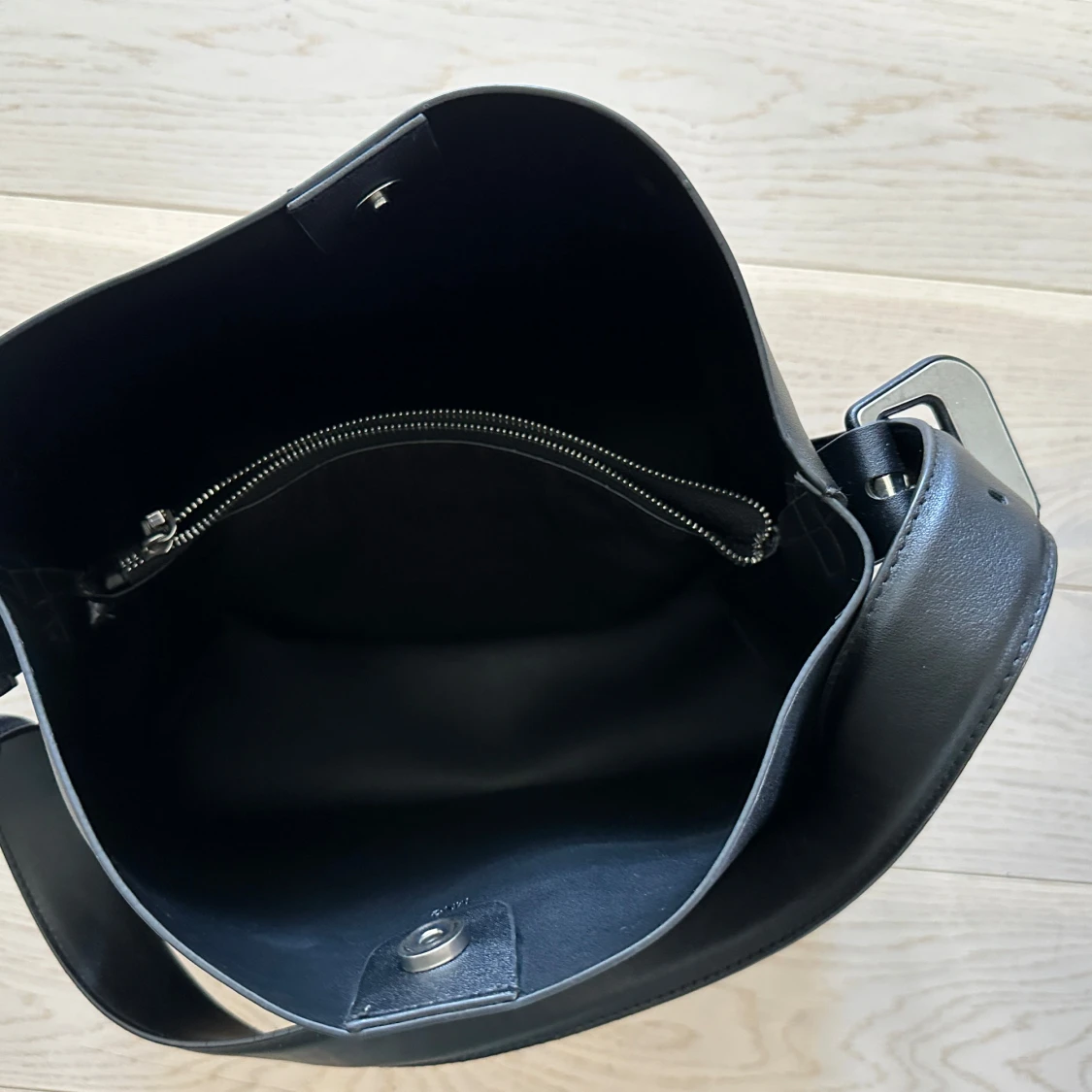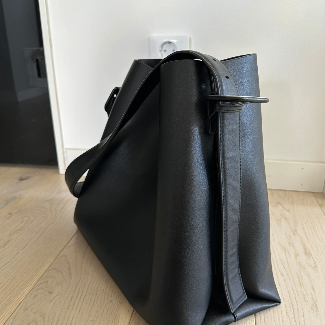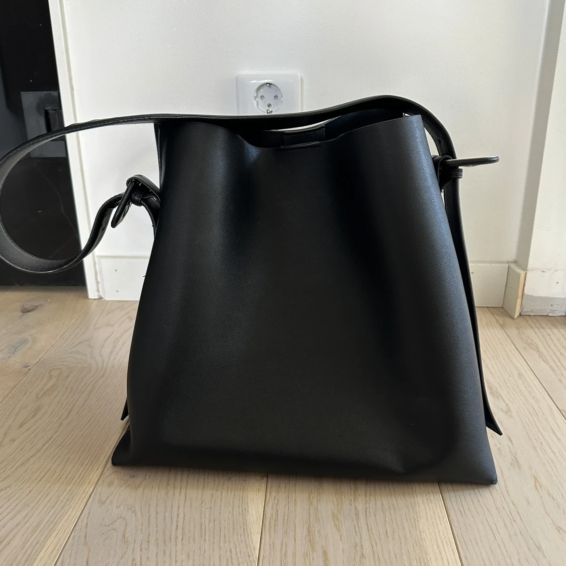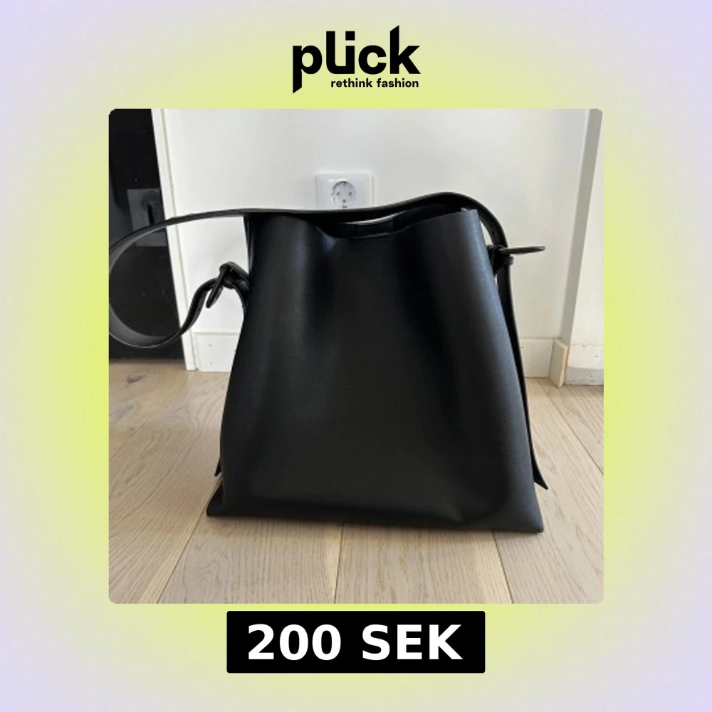 Stilren svart axelväska i slätt skinn med justerbart axelband och knytning i sidorna. Väskan har ett stort huvudfack och en innerficka med dragkedja. Perfekt för dig som vill ha en rymlig och enkel väska till vardagen.