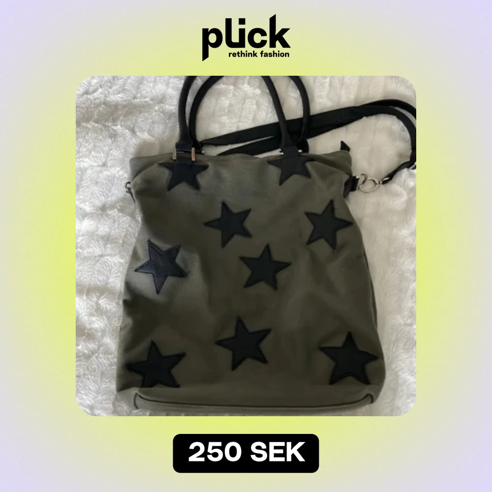 Rymlig väska, med flera fickor på insidan och ett på baksidan. Har band i läder, både ett längre axelband och ett kortare som funkar både för att hålla väskan i armvecket och på axeln. Stjärnor bara på framsidan.
