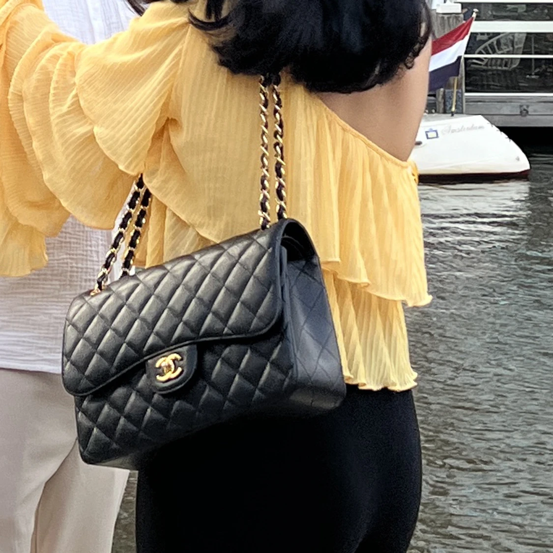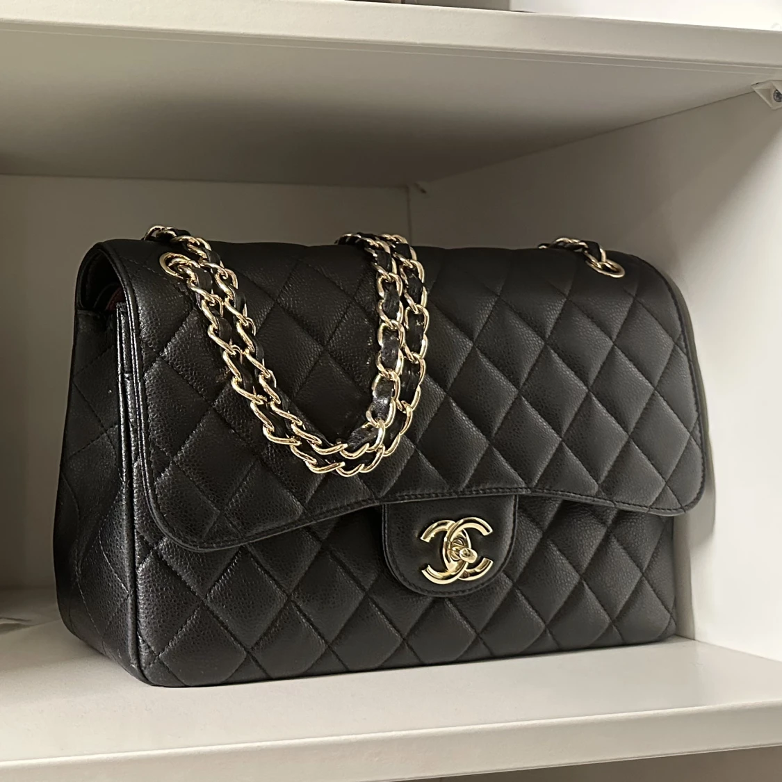 INTRESSEKOLL Handväska i äkta 7a läder, kvalité och utseende ser ut som original i stort sett. Använd max 5 gånger och nu står den bara i garderoben. Stl large/30cm OBS! Ser ut som silver pga ljuset men detaljerna är mässing.