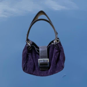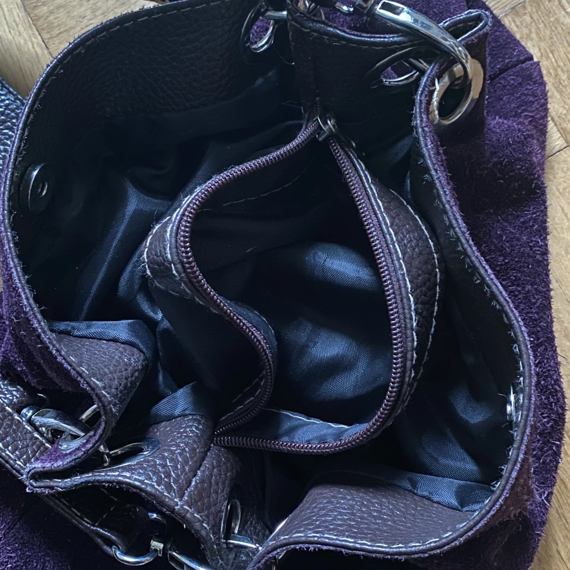 Liten men rymlig suede axelväska. Varm lika i färg med avtagningsbara handtag plus ett fack med dragkedja inuti.