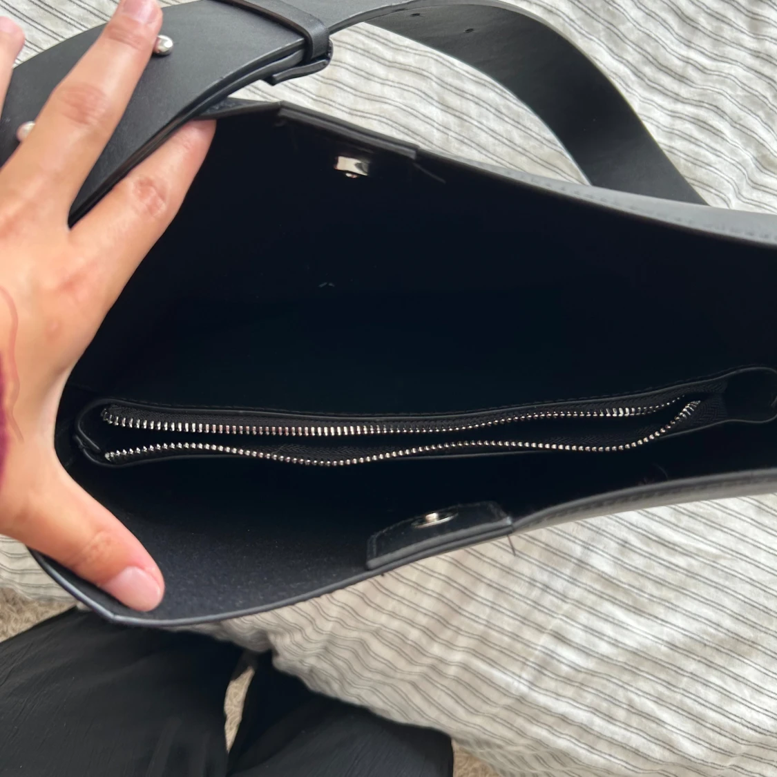 Svart axelväska i skinn med bred rem