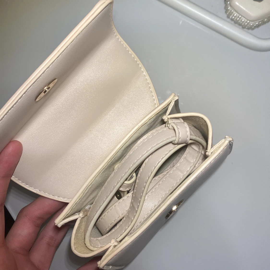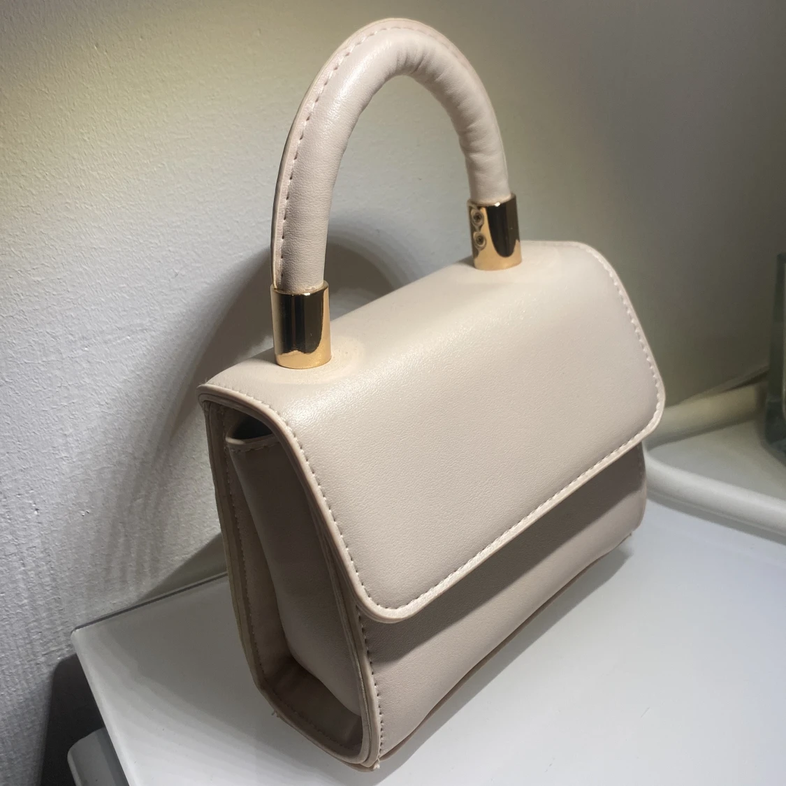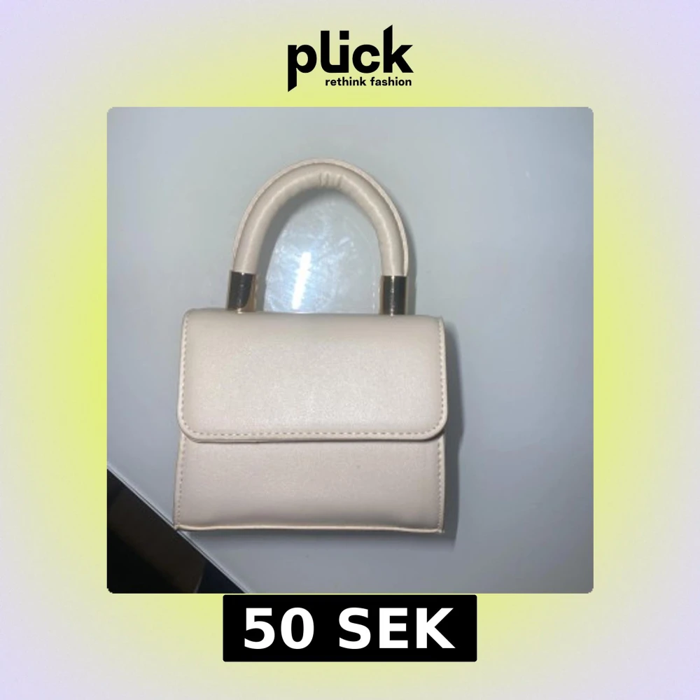 Säljer en beige mini axelväska med stilrena gulddetaljer på handtaget. Väskan har ett avtagbart axelband och ett klassiskt, stilrent utseende. Perfekt för dig som gillar minimalistisk design och vill ha en liten väska till det viktigaste. Perfekt till sommaren! ☀️🥂