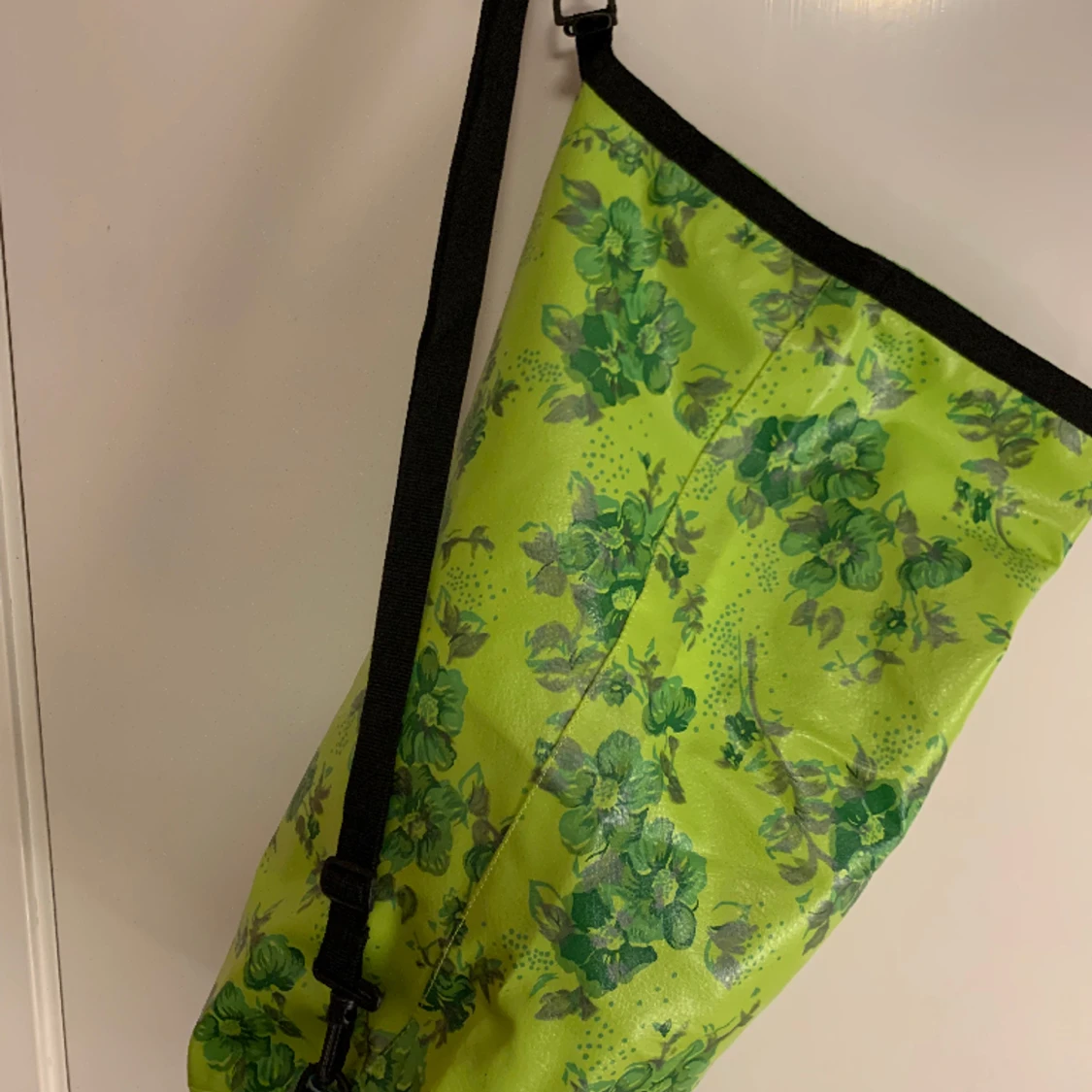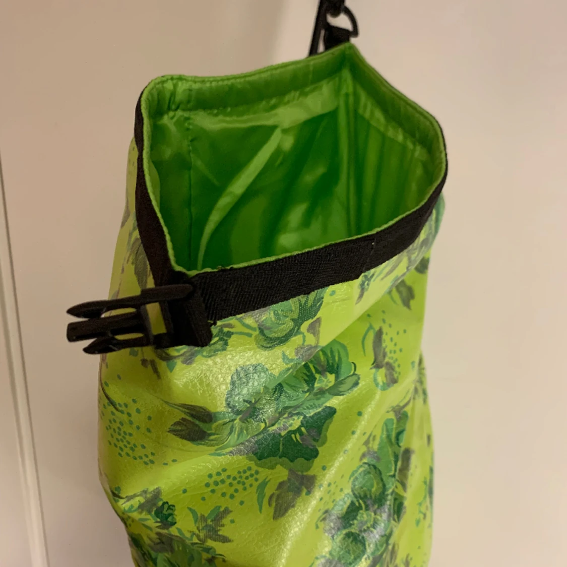 Roll Up väska, vattentät och man rullar och knäpper ihop den.