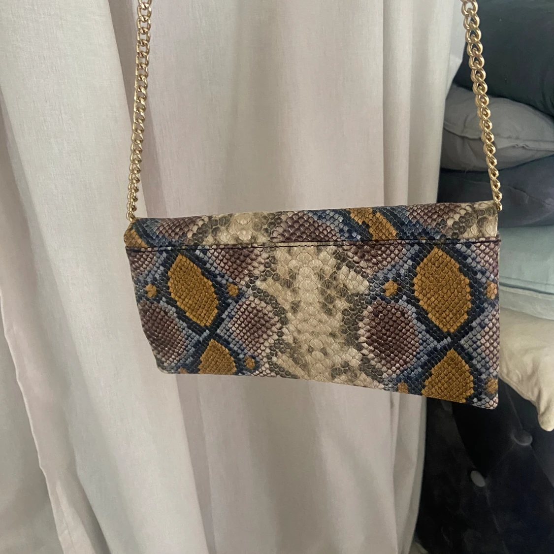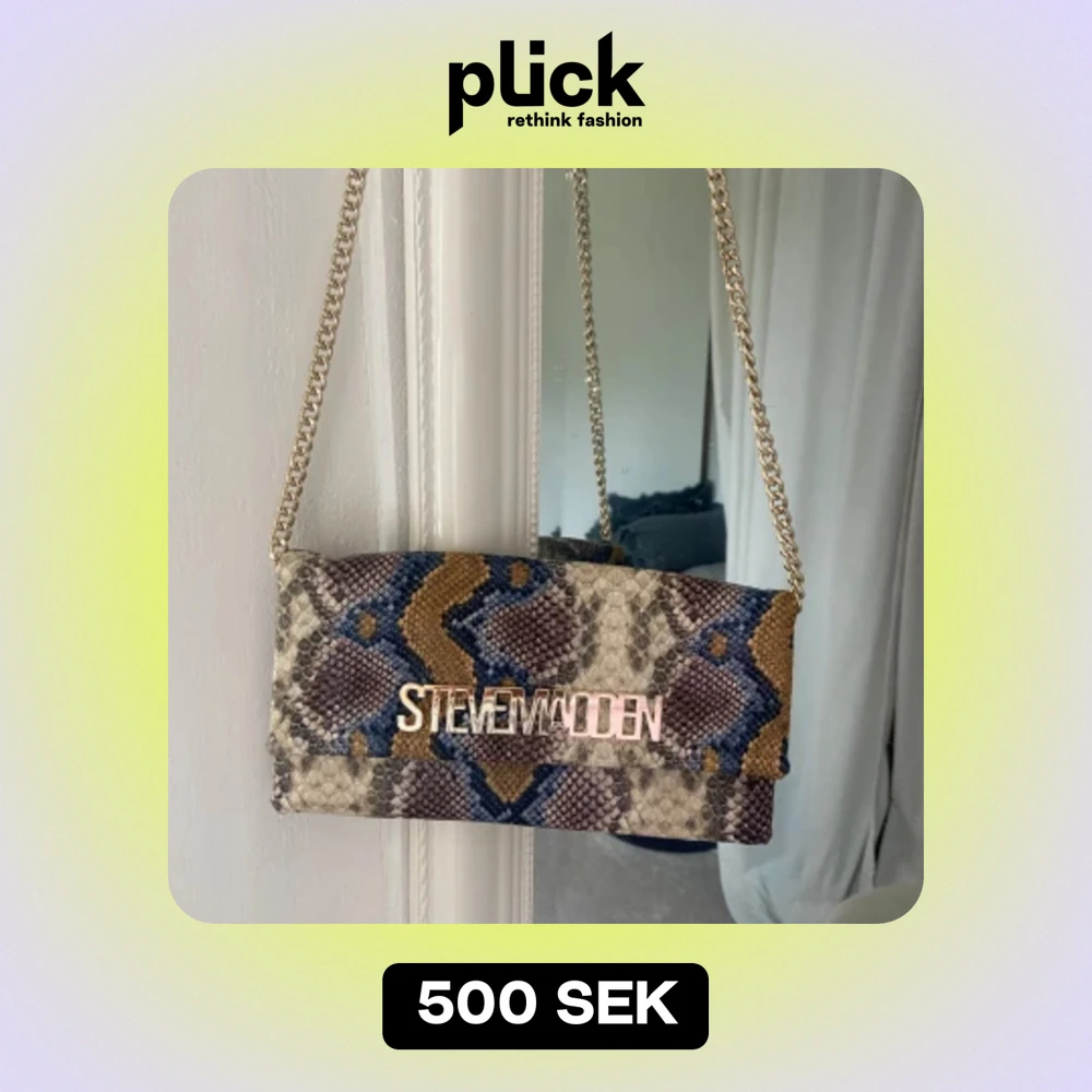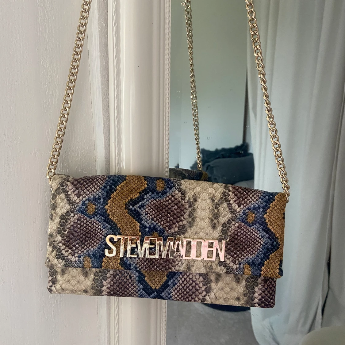 Steve Madden väska i flerfärgat ormprint. En liten krossbodyväska med lång guldig kedja. Man kan även vika in kedjan så den blir kortare, då kan väskan användas som en axelväska. Nyskick, använd ett fåtal gånger.