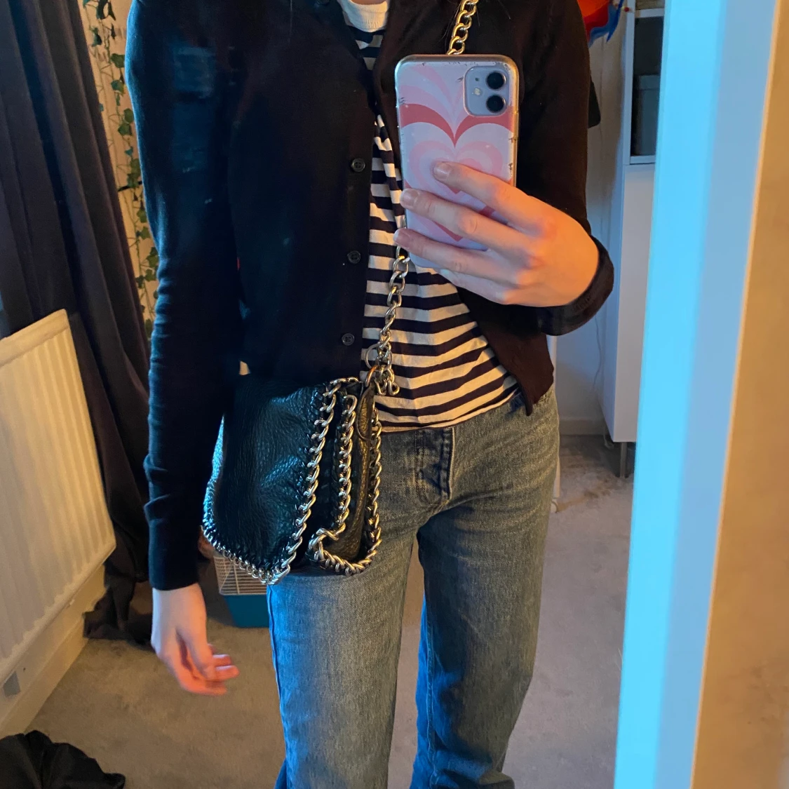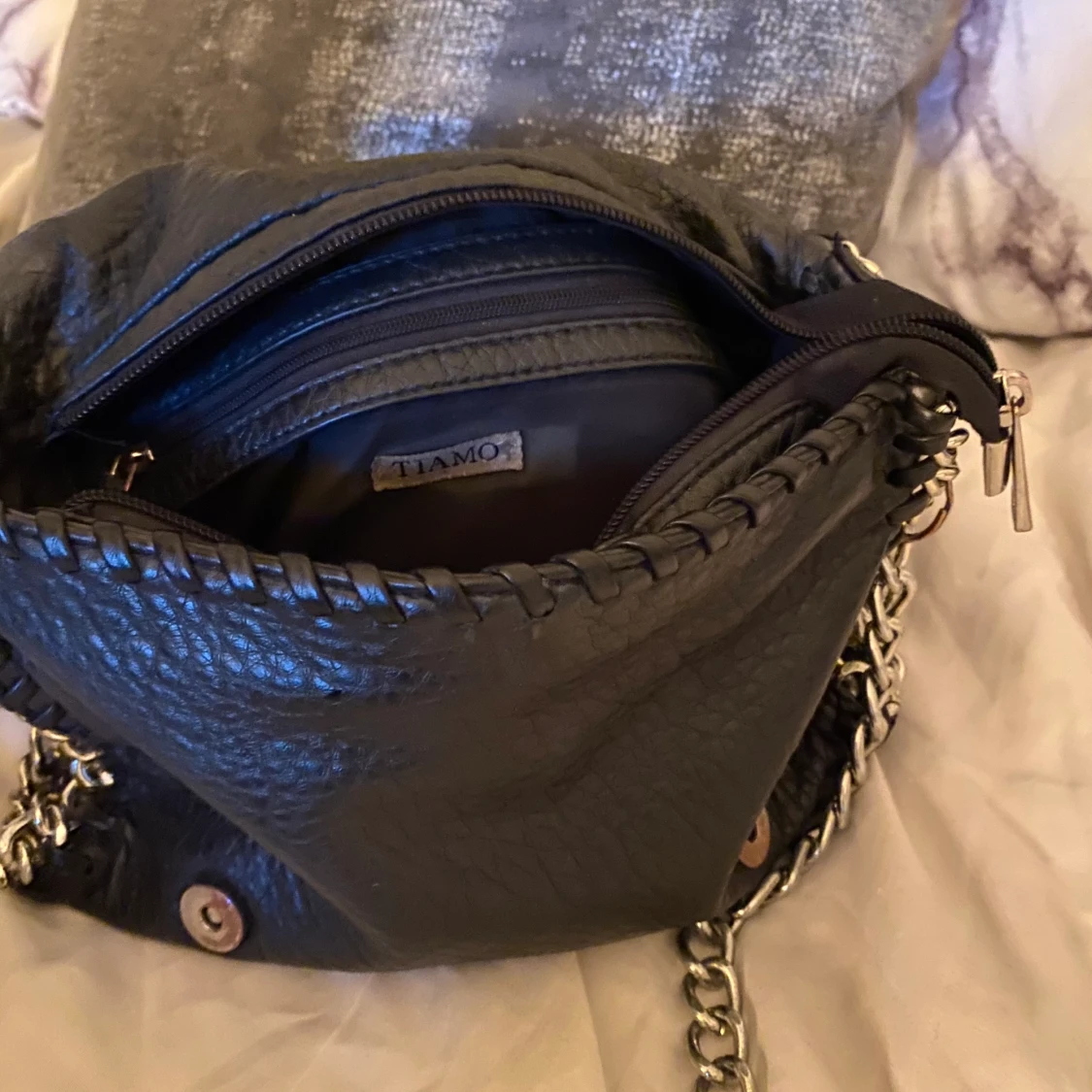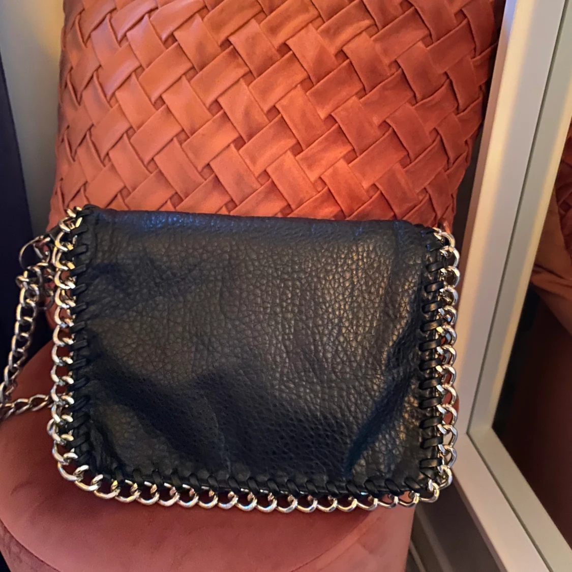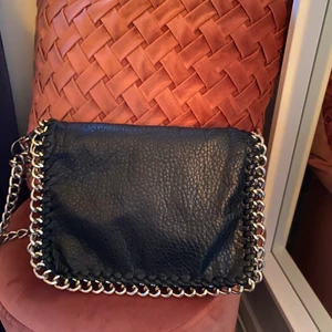 Den är svart och har dragkedja. Den har ett fack innuti och sen ett fack bakom men dragkedjan är sönder men man lägger inte märke till det