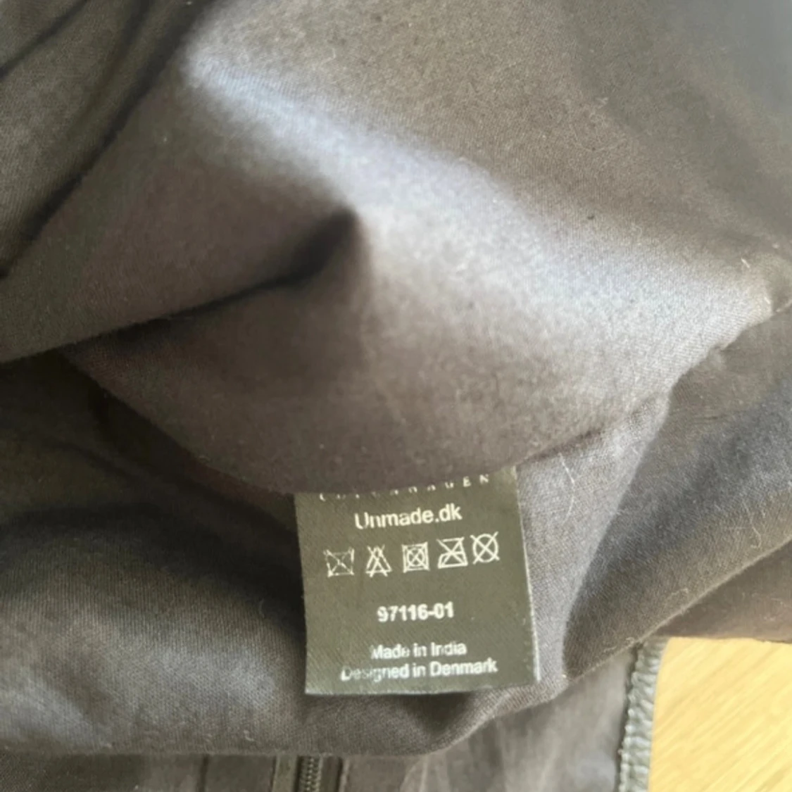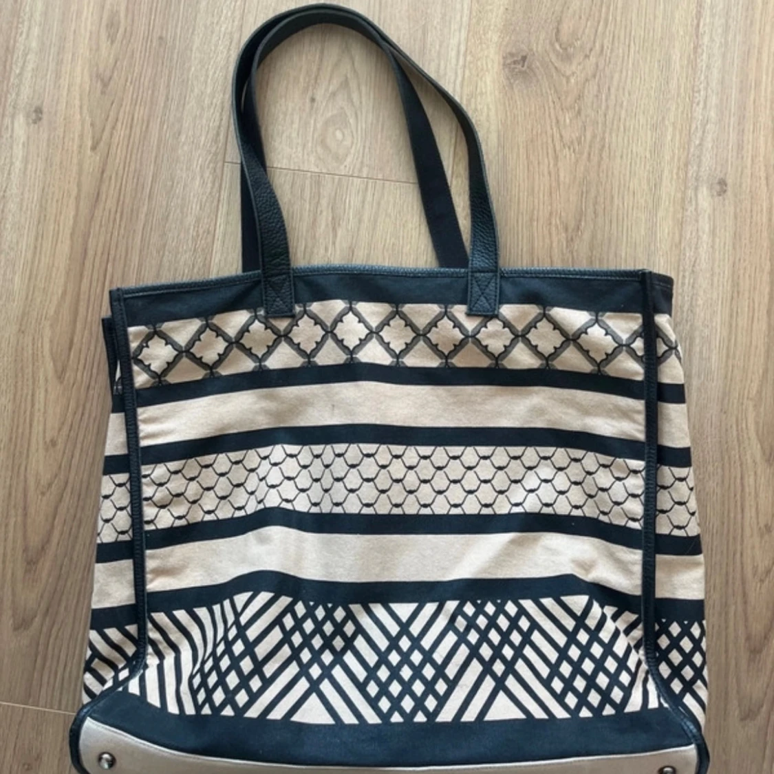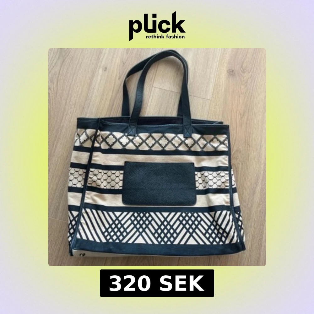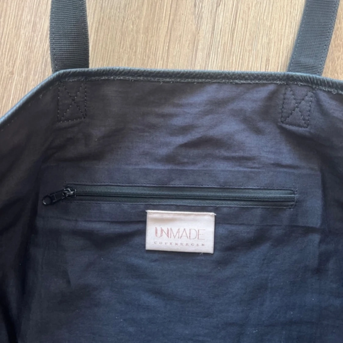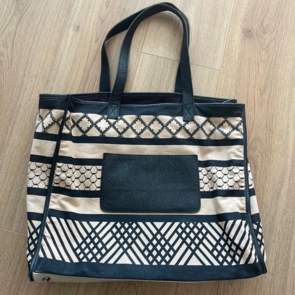 Stor väska från Unmade Copenhagen i svart och beige bomull med grafiska mönster. Väskan har svarta handtag i skinnimitation och en stor ytterficka framtill. Invändigt finns en dragkedjeficka för småsaker. Perfekt för dig som gillar unik design.
