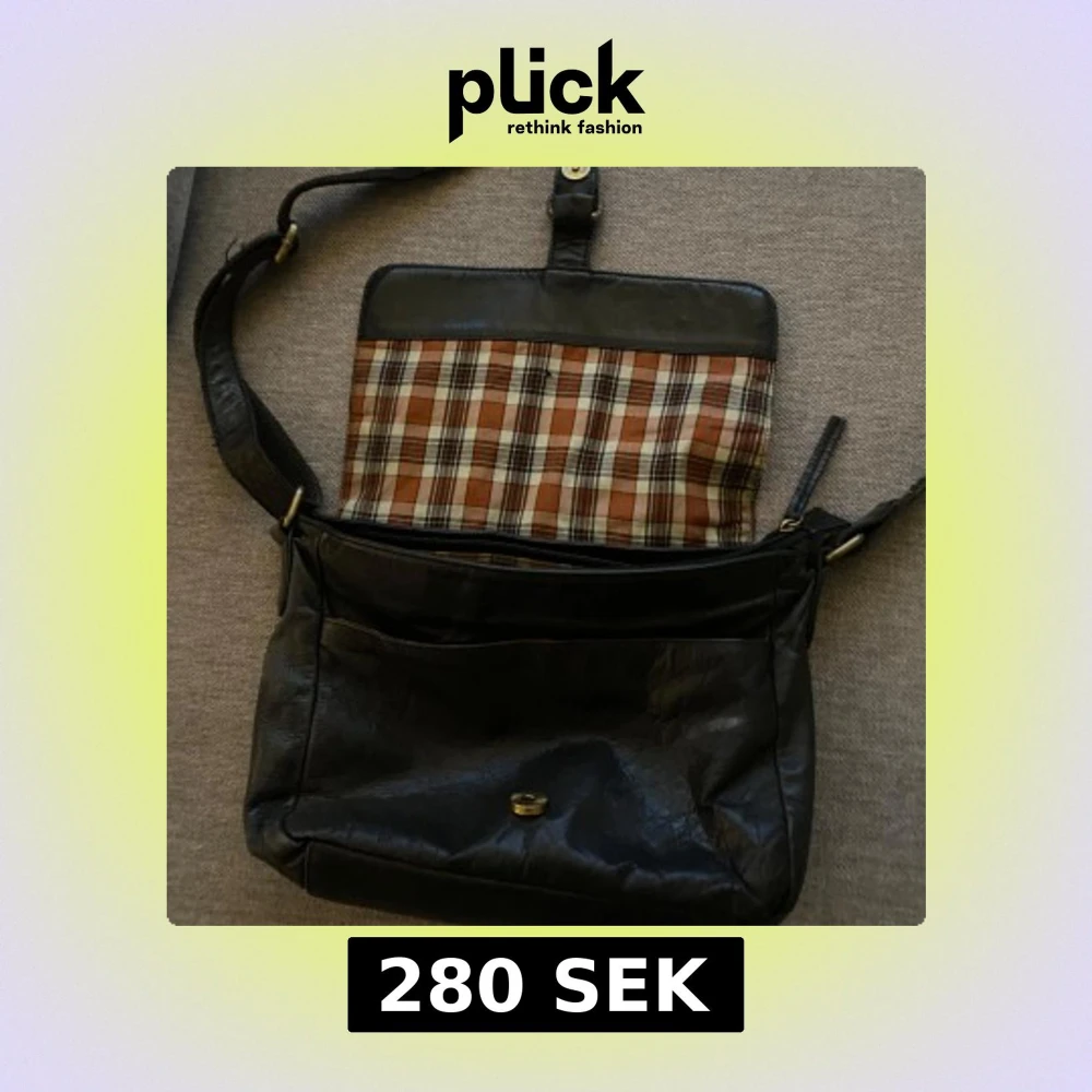 Snygg svart axelväska i skinn med ett klassiskt rutigt foder i brunt, beige och vitt. Väskan har en justerbar axelrem och stängs med ett spänne. Perfekt för att bära dina dagliga nödvändigheter med stil. Vintage