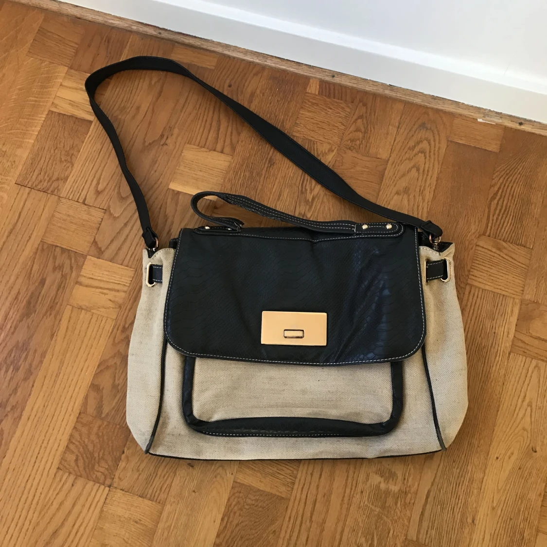 Axelremsväska i bra skick, biege/svart med gulddetaljer!