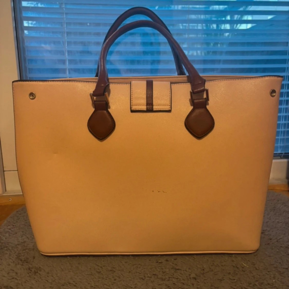Stilren beige handväska med bruna handtag och detaljer. Väskan har en rymlig insida med flera fack och är tillverkad i syntetmaterial med struktur. Perfekt för dig som vill ha en klassisk och enkel väska med plats för allt du behöver.