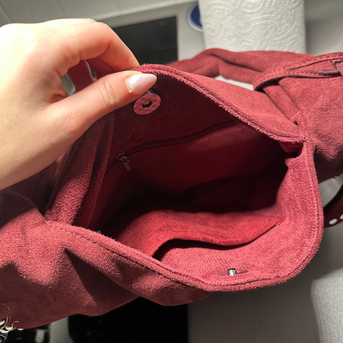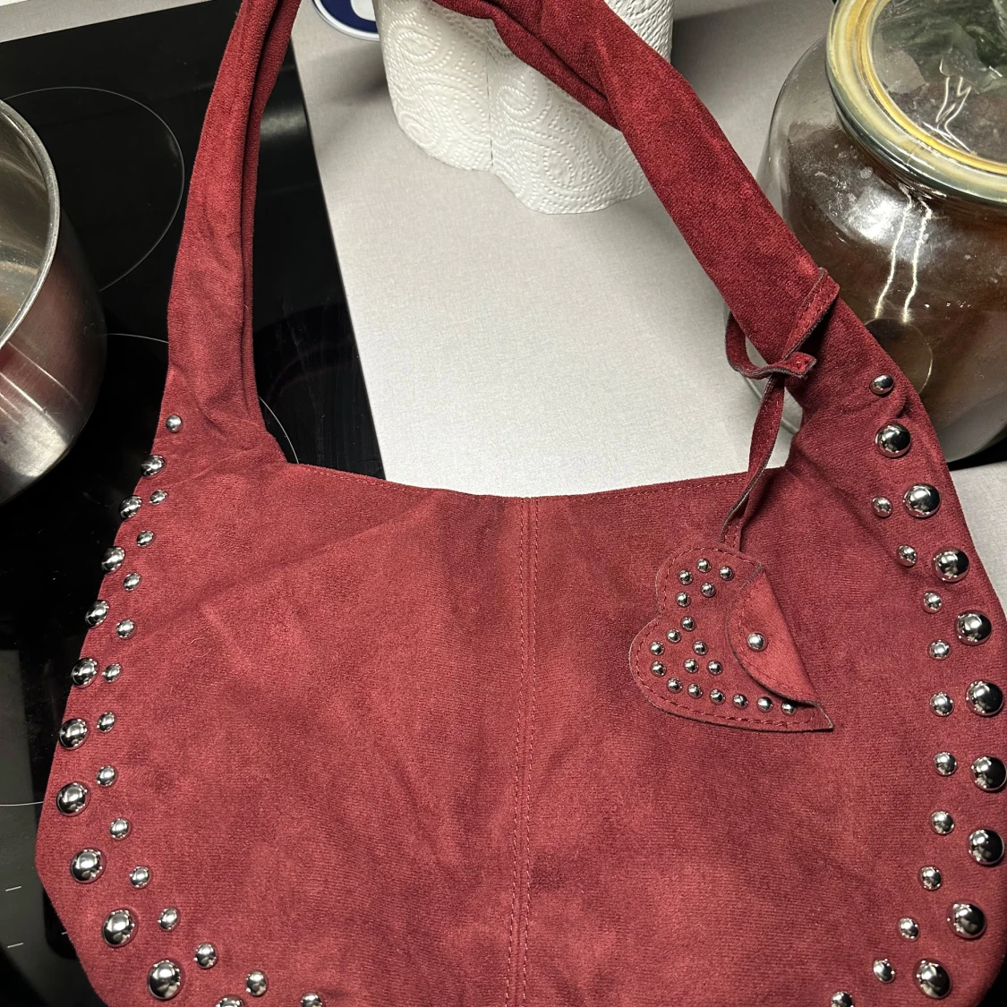 Snygg röd axelväska i mockaimitation med dekorativa nitar längs kanterna. Väskan har en praktisk storlek och ett hjärtformat hänge. Perfekt för att ge en edgy touch till din outfit. Inga defekter . Obs bilden visar inte riktigt färgen , den är mer vinröd i verkligen