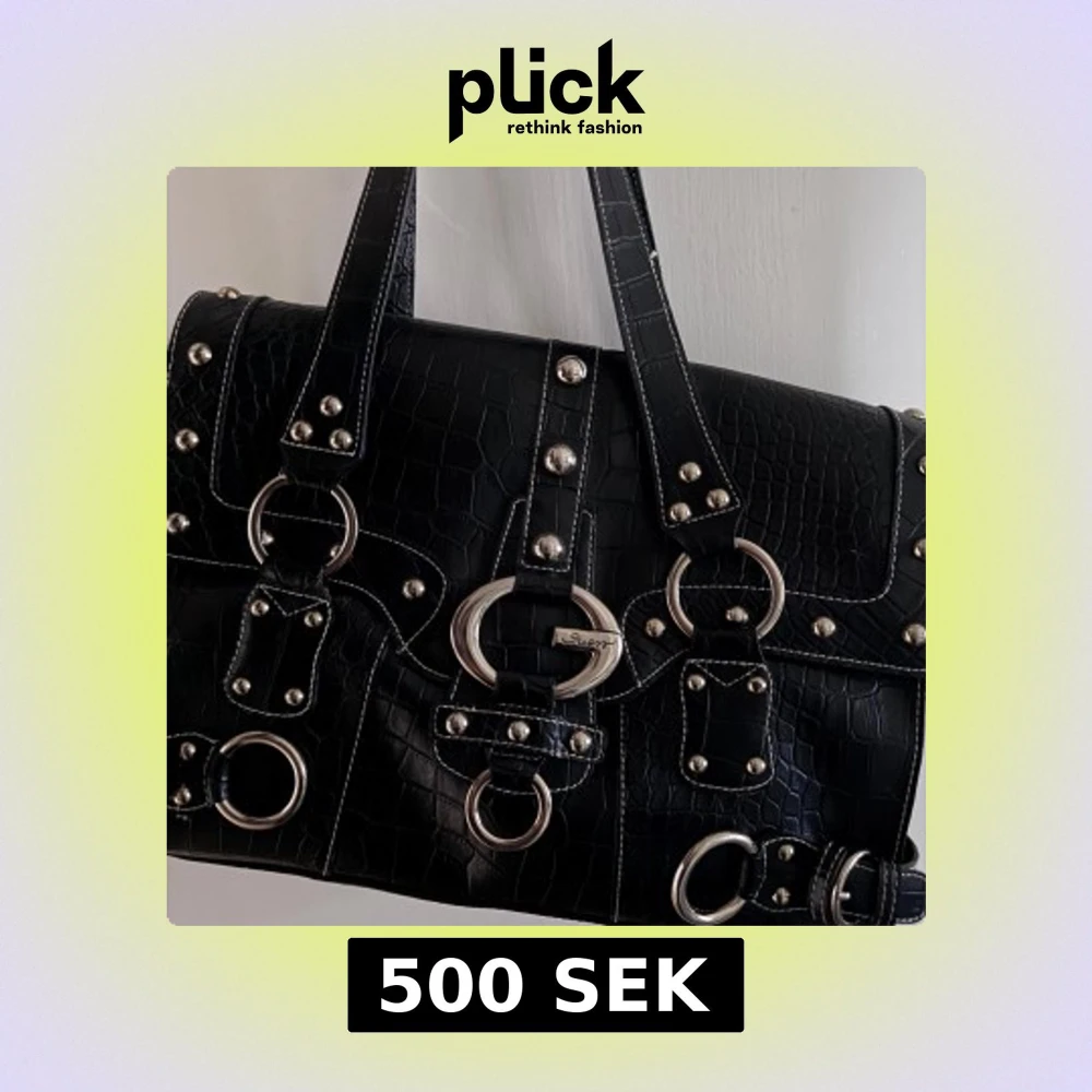 Snygg svart axelväska i skinnimitation med krokodilpräglat mönster. Väskan har flera dekorativa metallringar och nitar