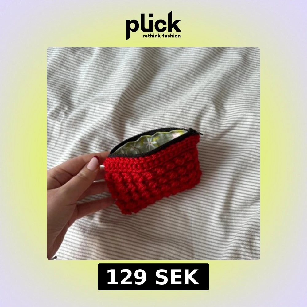 Egentillverkad virkad necessär i ett rött garn med innertyg och dragkedja. Höjd ca 9 cm längd ca 13 cm