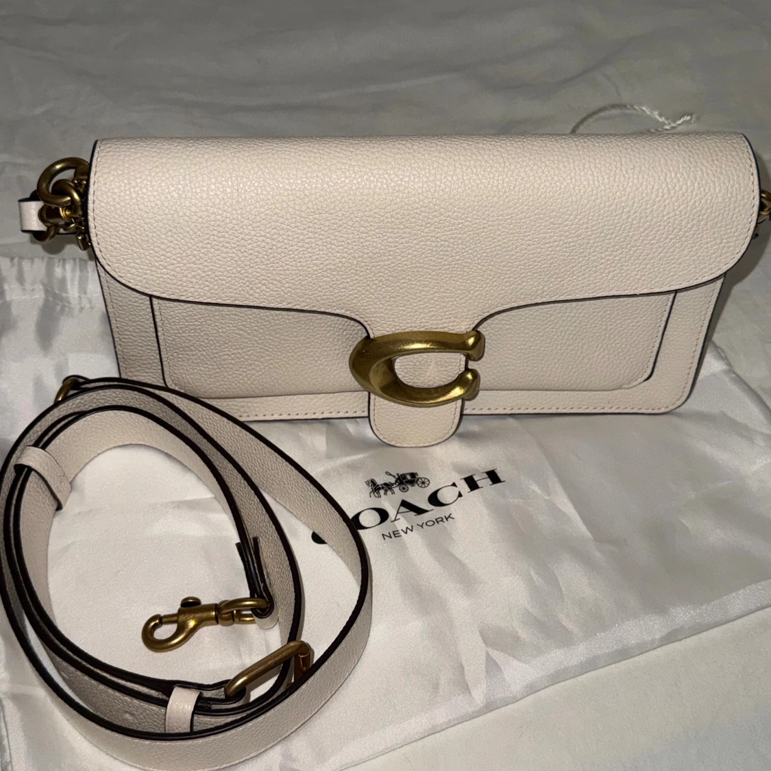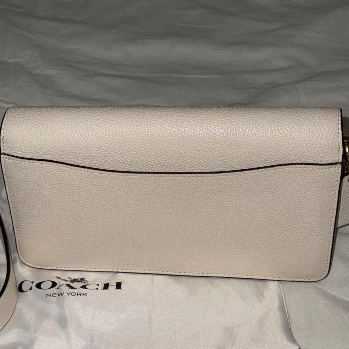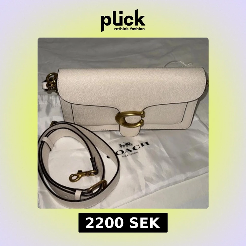 Snygg axelväska från Coach i ljusbeige skinn med justerbar rem och guldfärgade metalldetaljer. Väskan har ett stort C-spänne framtill, innerfack med dragkedja och stilren design. Perfekt för dig som gillar klassiska och trendiga accessoarer.