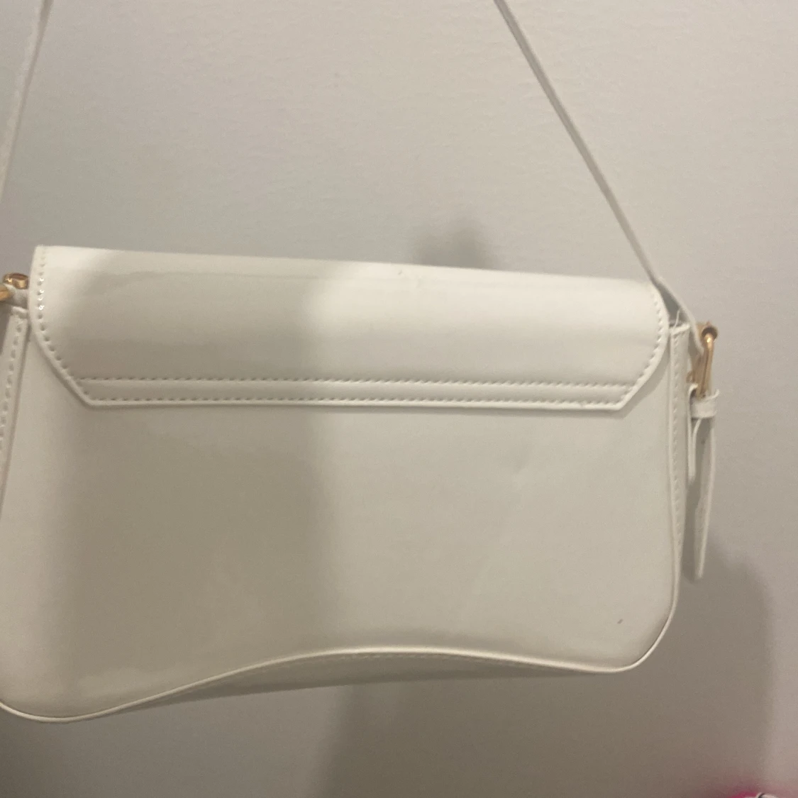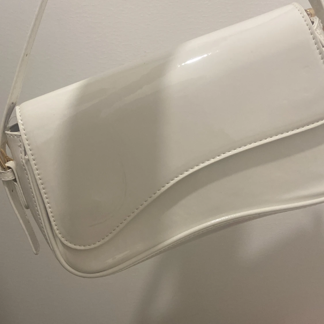 Snygg vit axelväska med stilren, böjd form och guldfärgade detaljer vid remmarna. Väskan har en slät, glansig yta och är tillverkad i syntetmaterial. Perfekt storlek för det viktigaste och enkel att matcha med olika outfits.