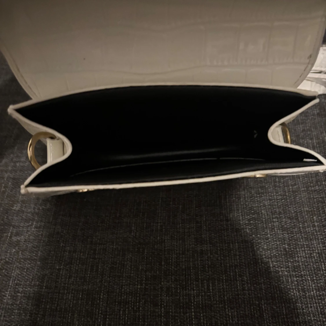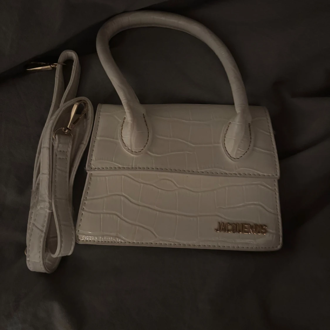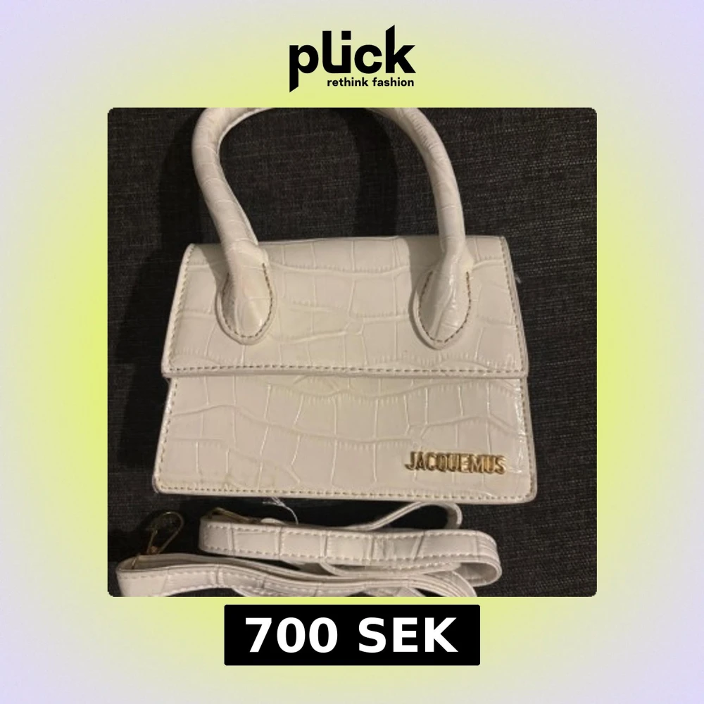 Snygg vit handväska från Jacquemus med croco-mönstrad yta och guldfärgad logga framtill. Väskan är smutsig där bak men inget man lägger märke till. Pris går att diskutera 💓