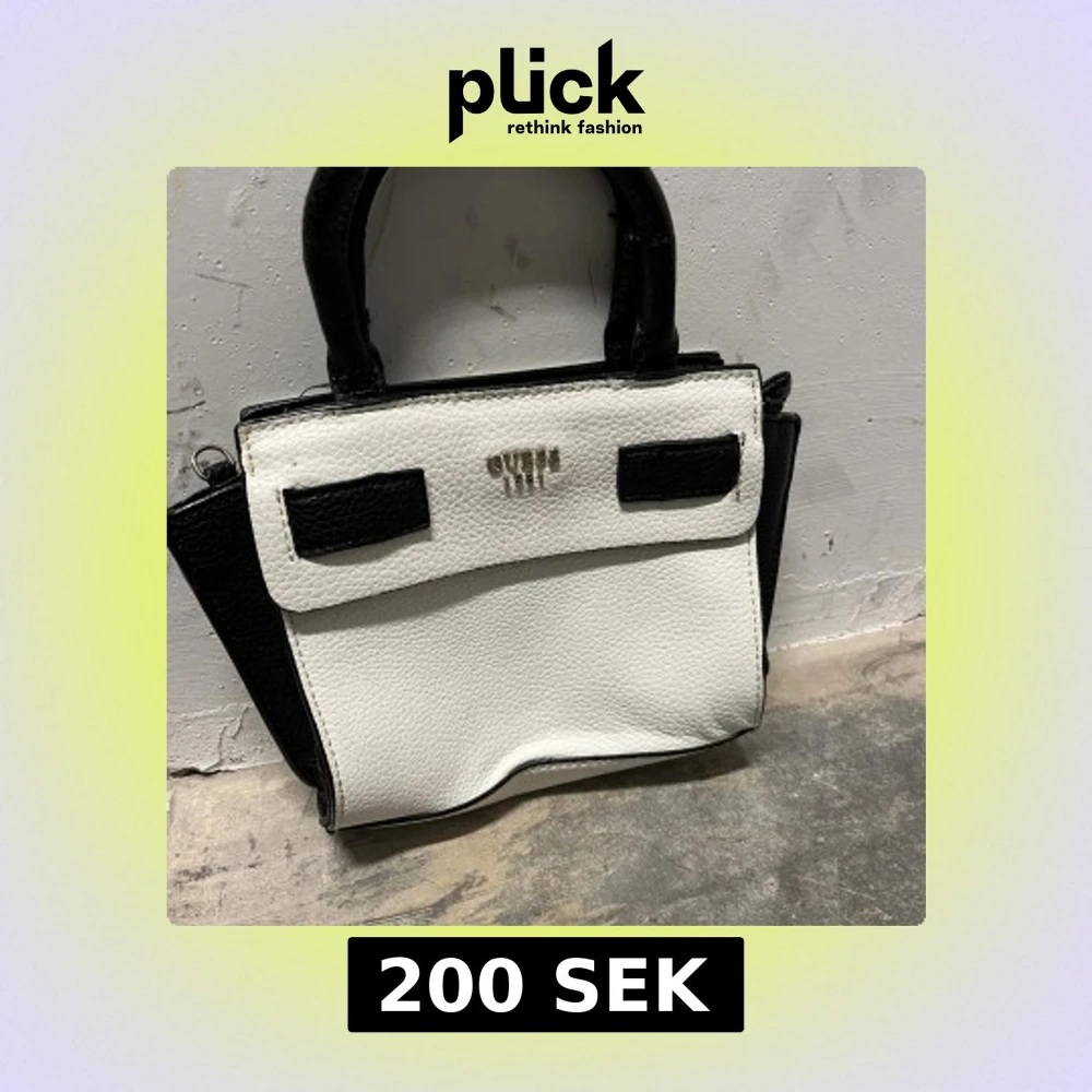 Snygg handväska från Guess i vit och svart skinnimitation med stilrena detaljer. Väskan har två handtag, dragkedja upptill och logotyp i metall framtill. Insidan är fodrad med mönstrat tyg och har en innerficka med dragkedja. Perfekt storlek för det viktigaste .Obs!-Något sliten på handtagen, syns på bild 3, annars bra skick.