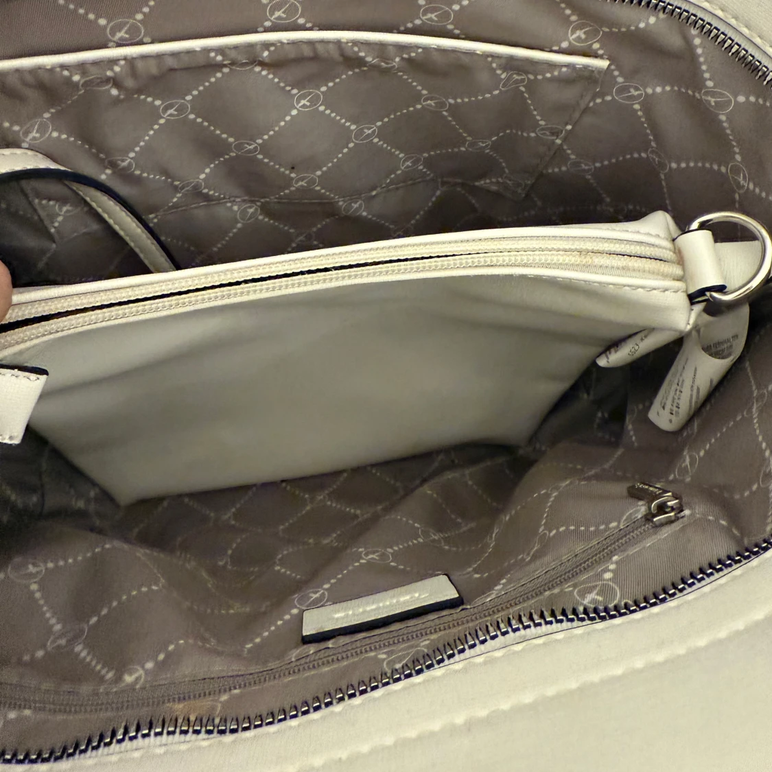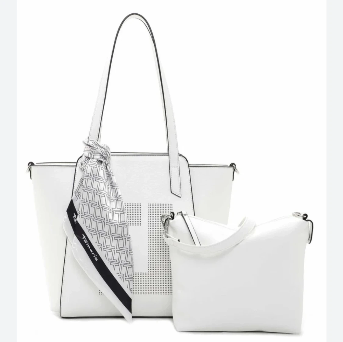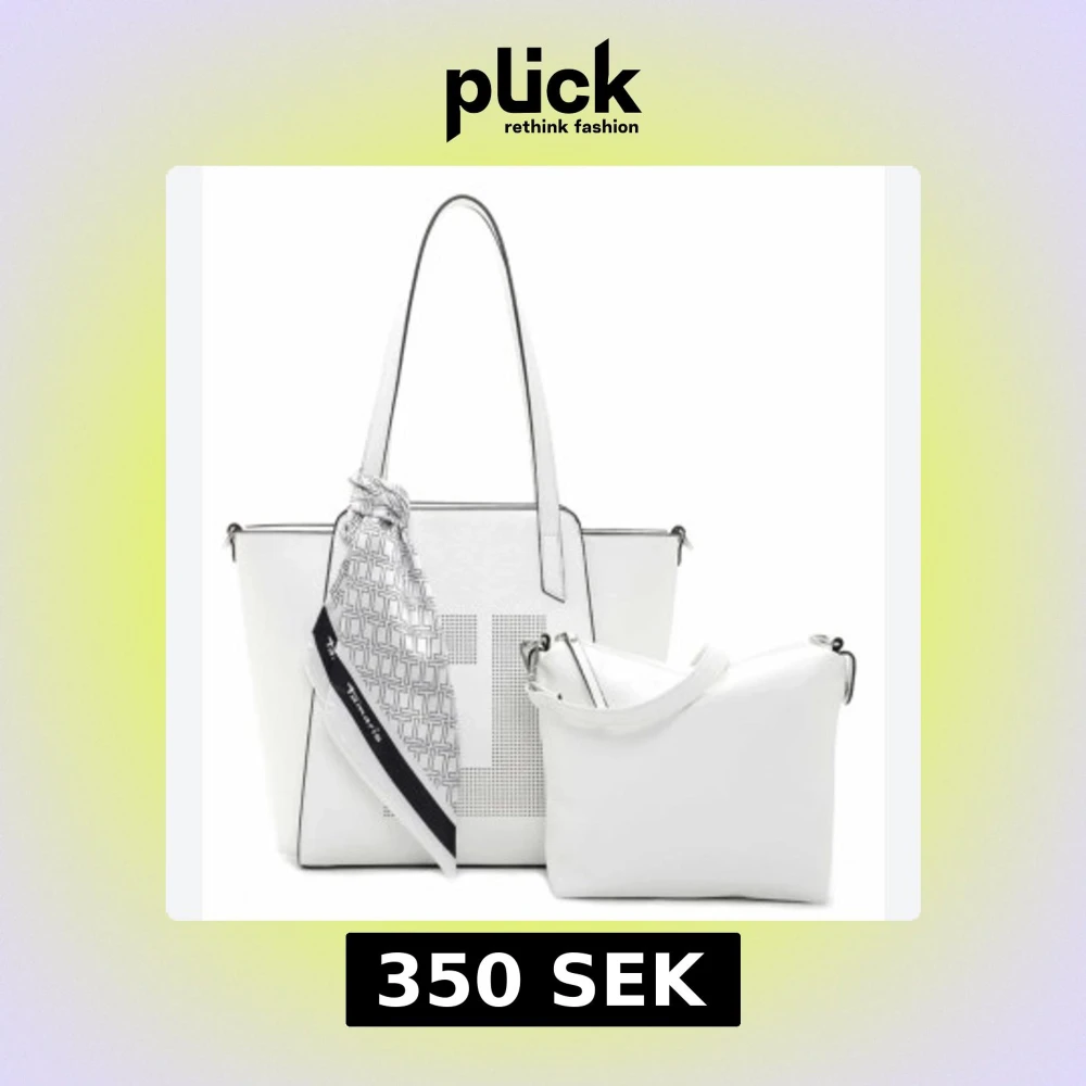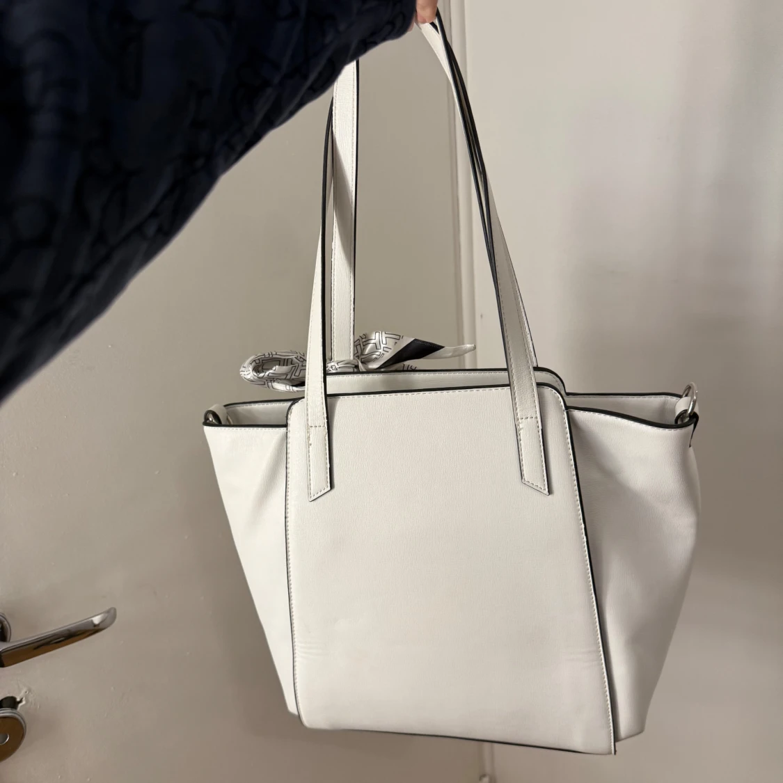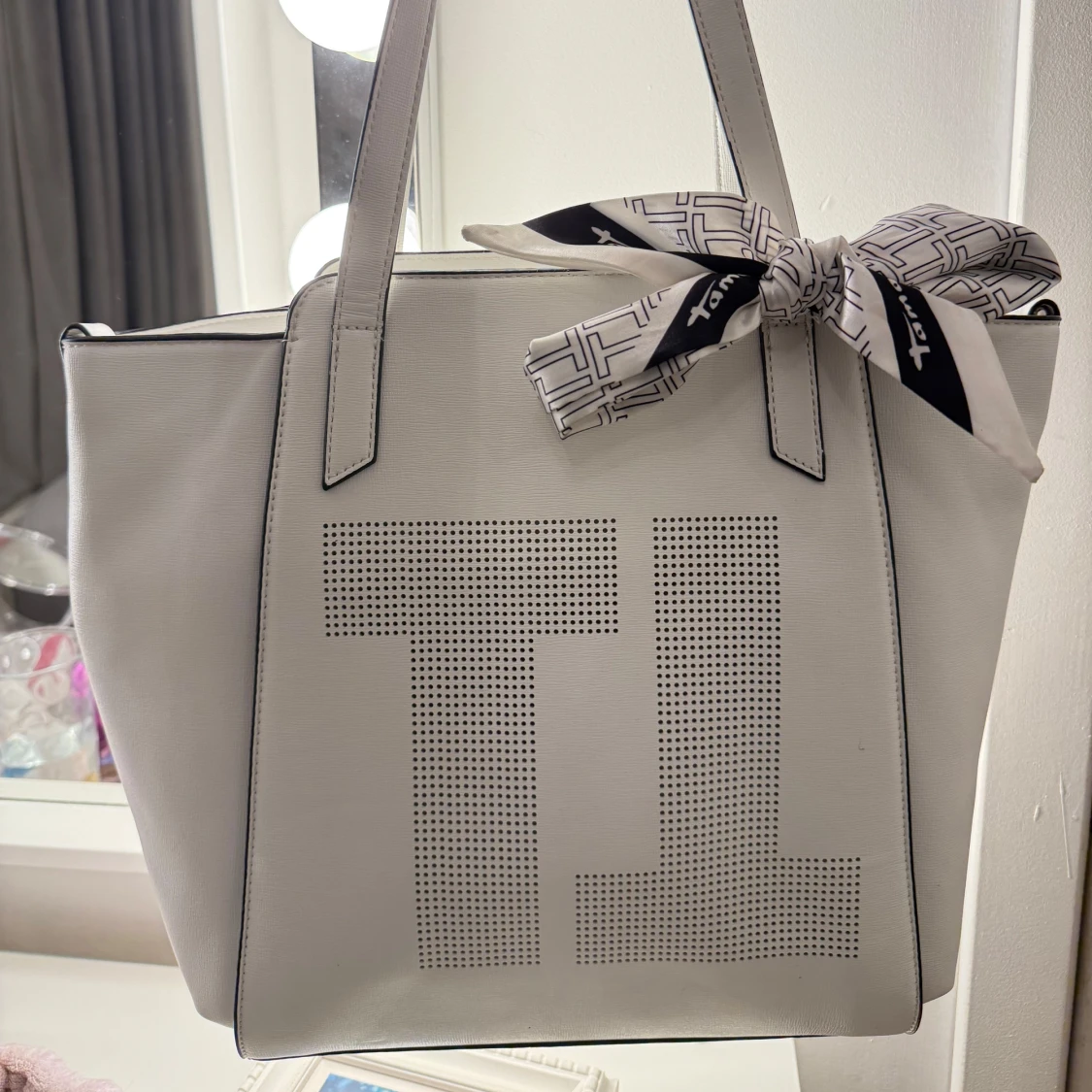 Elegant vit axelväska med ett stort TL-märke och en stilren scarf knuten på handtaget. Väskan har en praktisk dragkedja och rymligt inre med mönstrat foder. Perfekt för en chic och modern look. Köpt på zalando för 900 isch