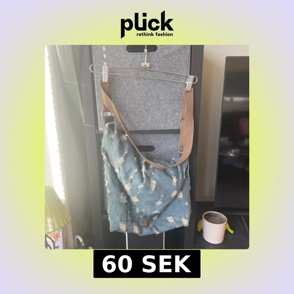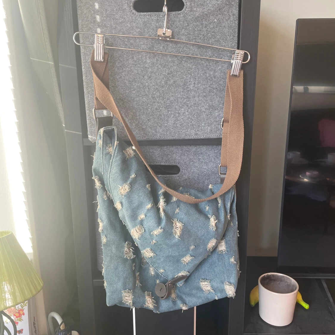 Cool axelväska i blå denim med massor av slitna detaljer och en bred, justerbar brun axelrem. Väskan har en avslappnad streetstil och stängs med knapp framtill. Perfekt för dig som gillar en edgy och unik look.
