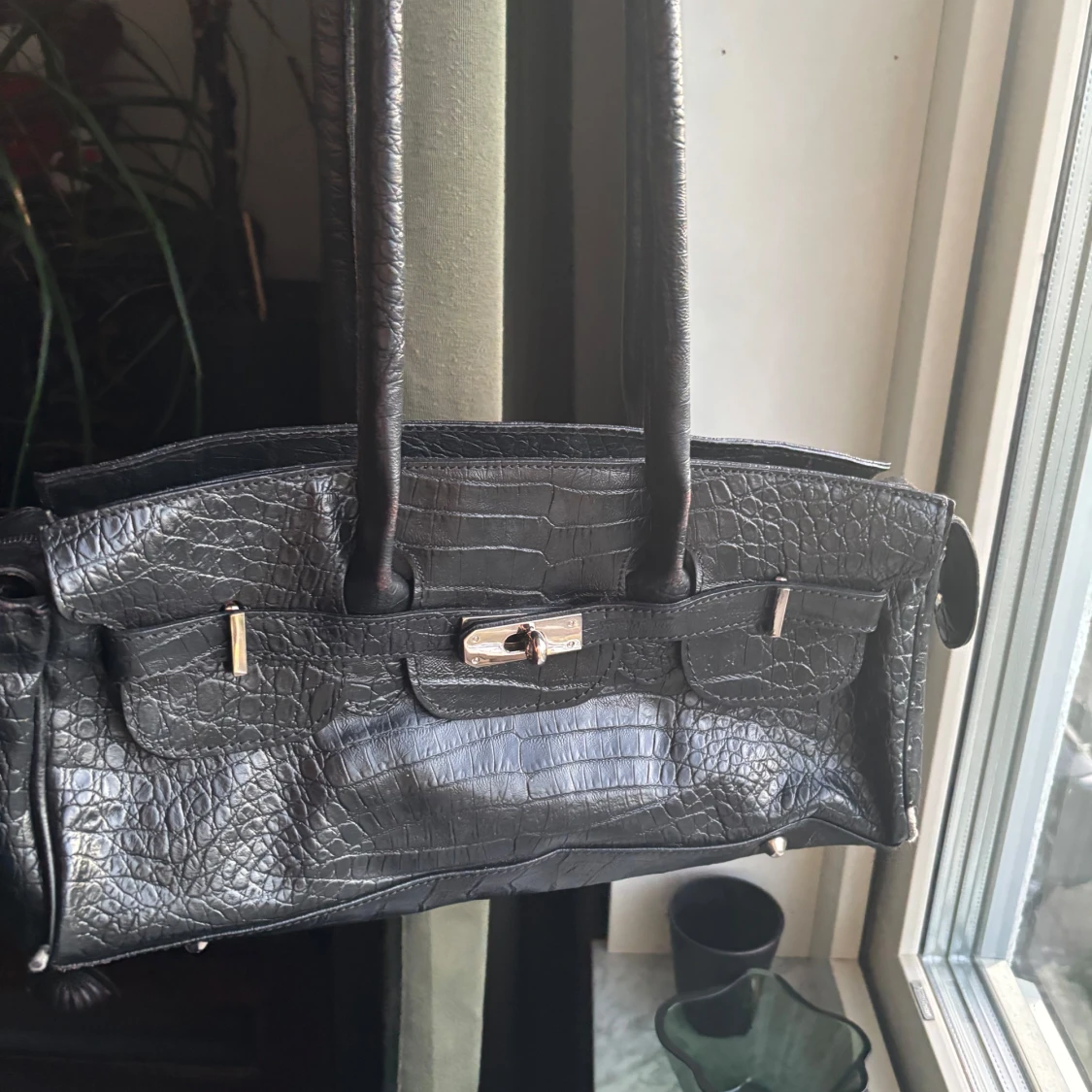 Snygg svart handväska med krokopräglat mönster och silverfärgade detaljer. Väskan har två rejäla handtag och ett klassiskt lås framtill. Perfekt storlek för att få plats med allt du behöver och ger en cool vibe till din outfit.