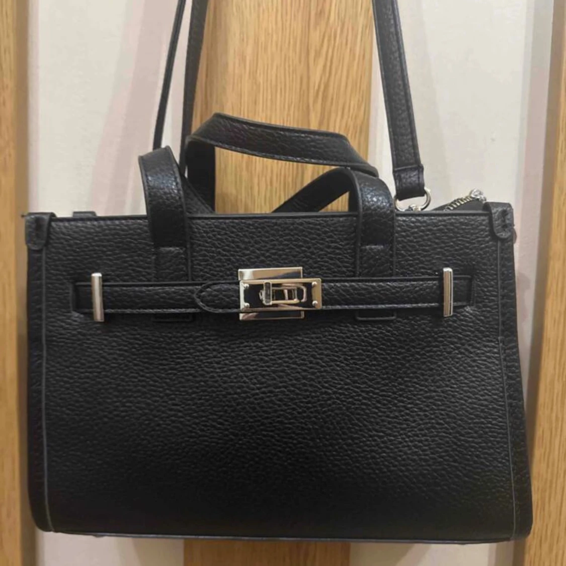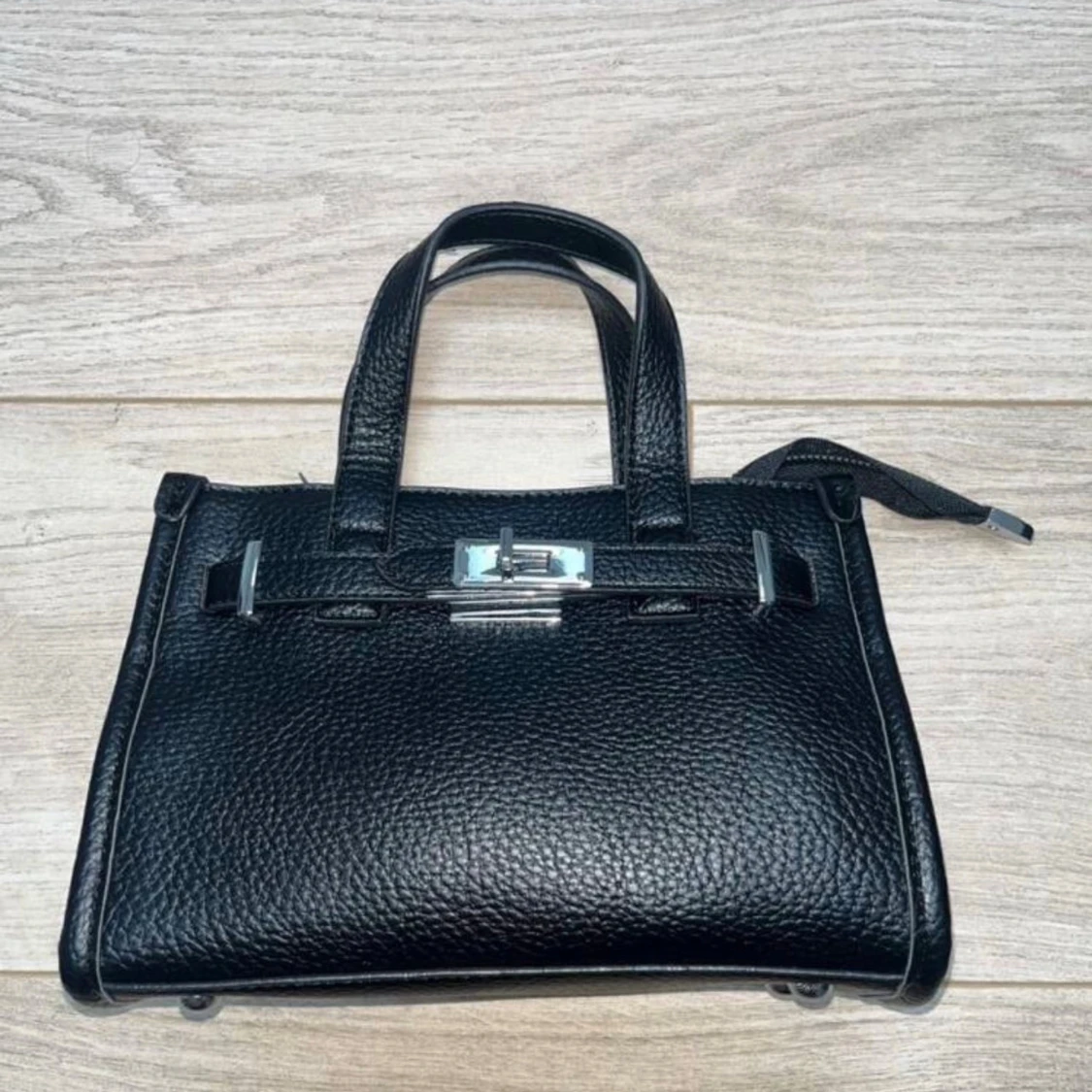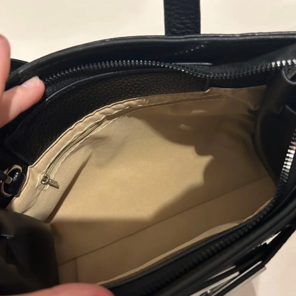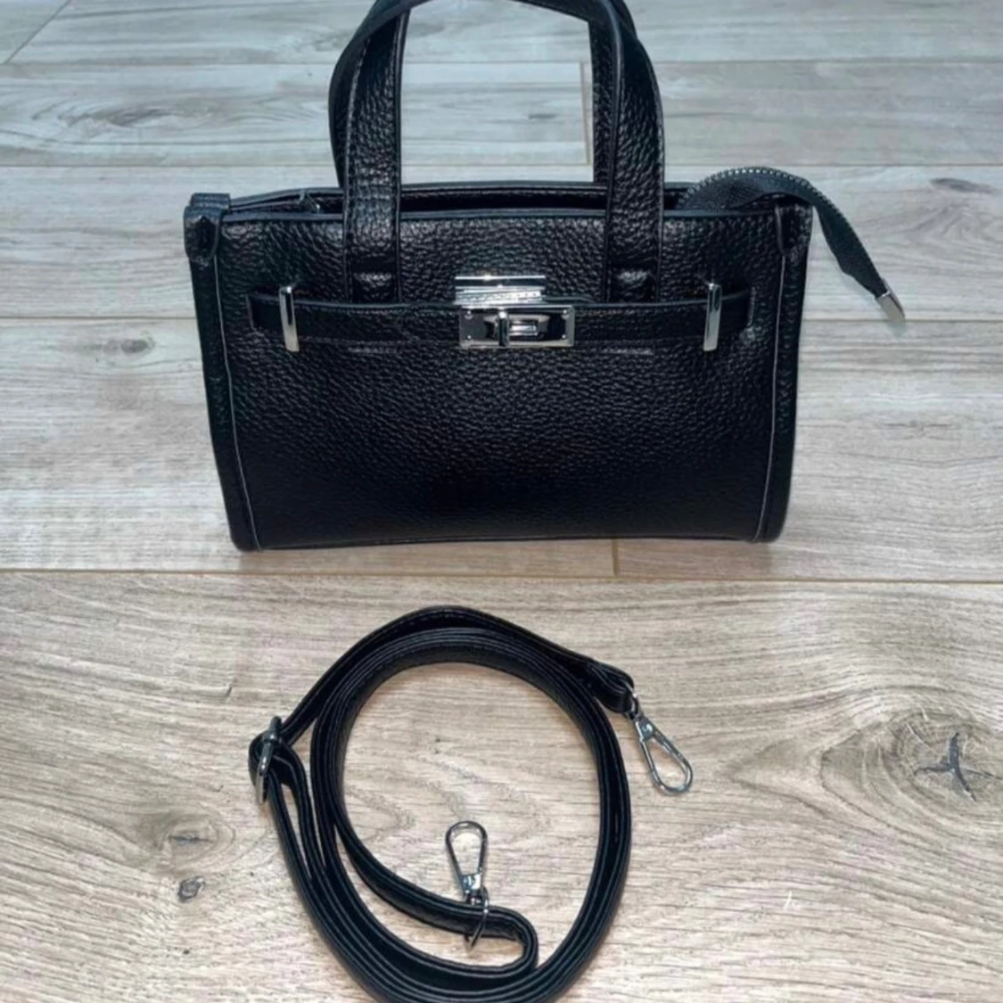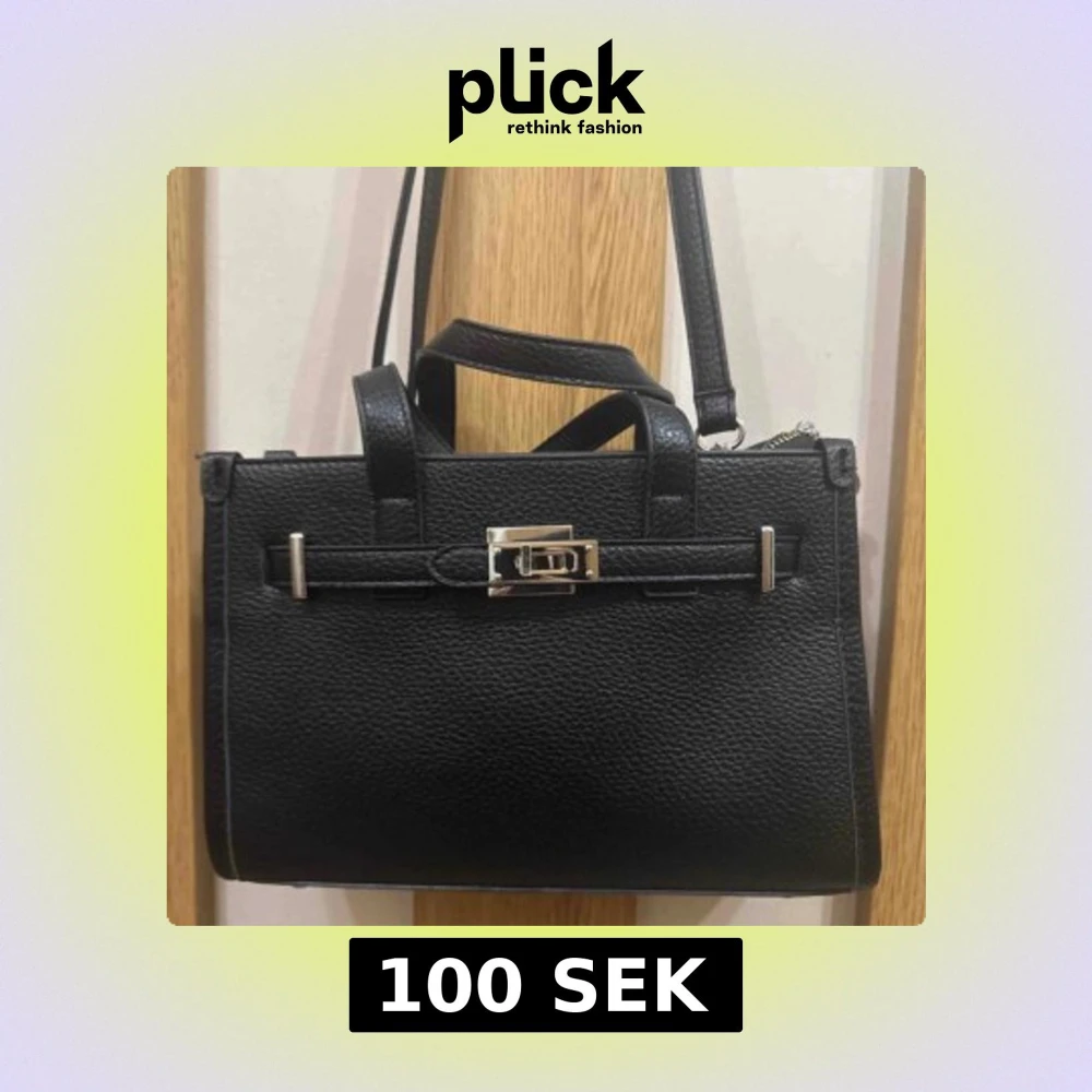Stilren svart handväska i skinn med grov struktur och silverfärgat spänne framtill. Väskan har både handtag och avtagbar axelrem, samt dragkedja upptill. Insidan är ljusbeige med en liten ficka med dragkedja. Perfekt storlek för det viktigaste.