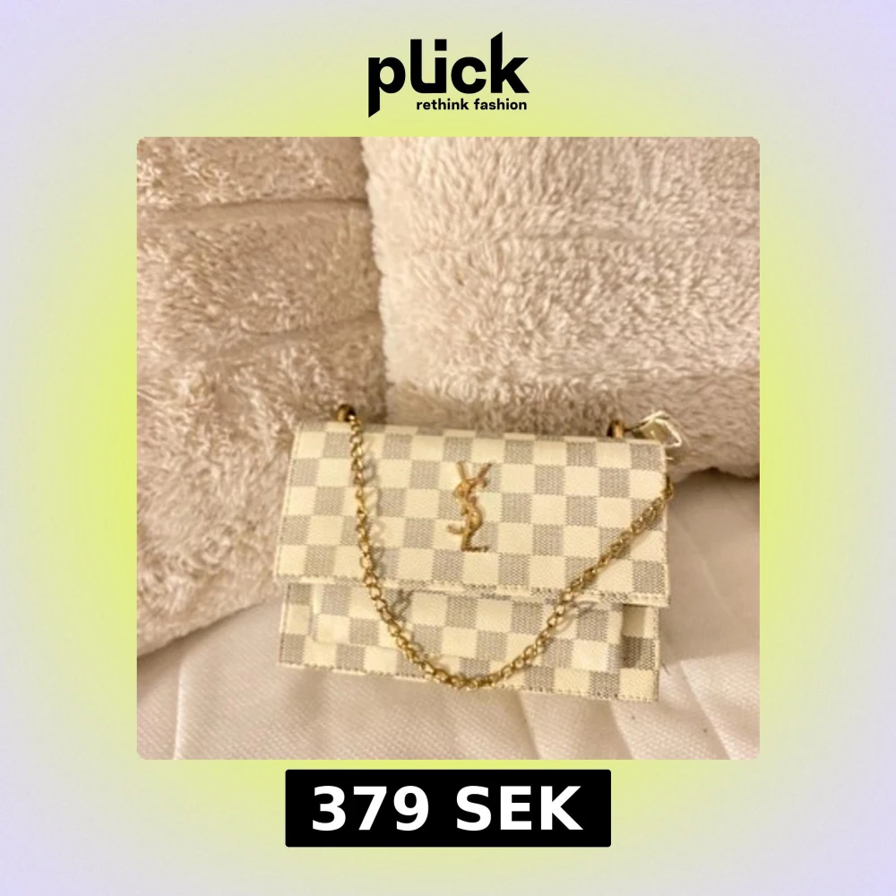 Snygg rutig handväska med kedjerem och ikonisk logotyp på framsidan. Väskan har en elegant design med en kombination av beige och vit färg. Perfekt för att ge en lyxig touch till din outfit.