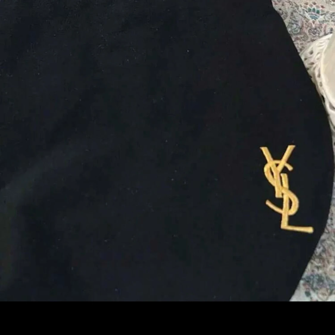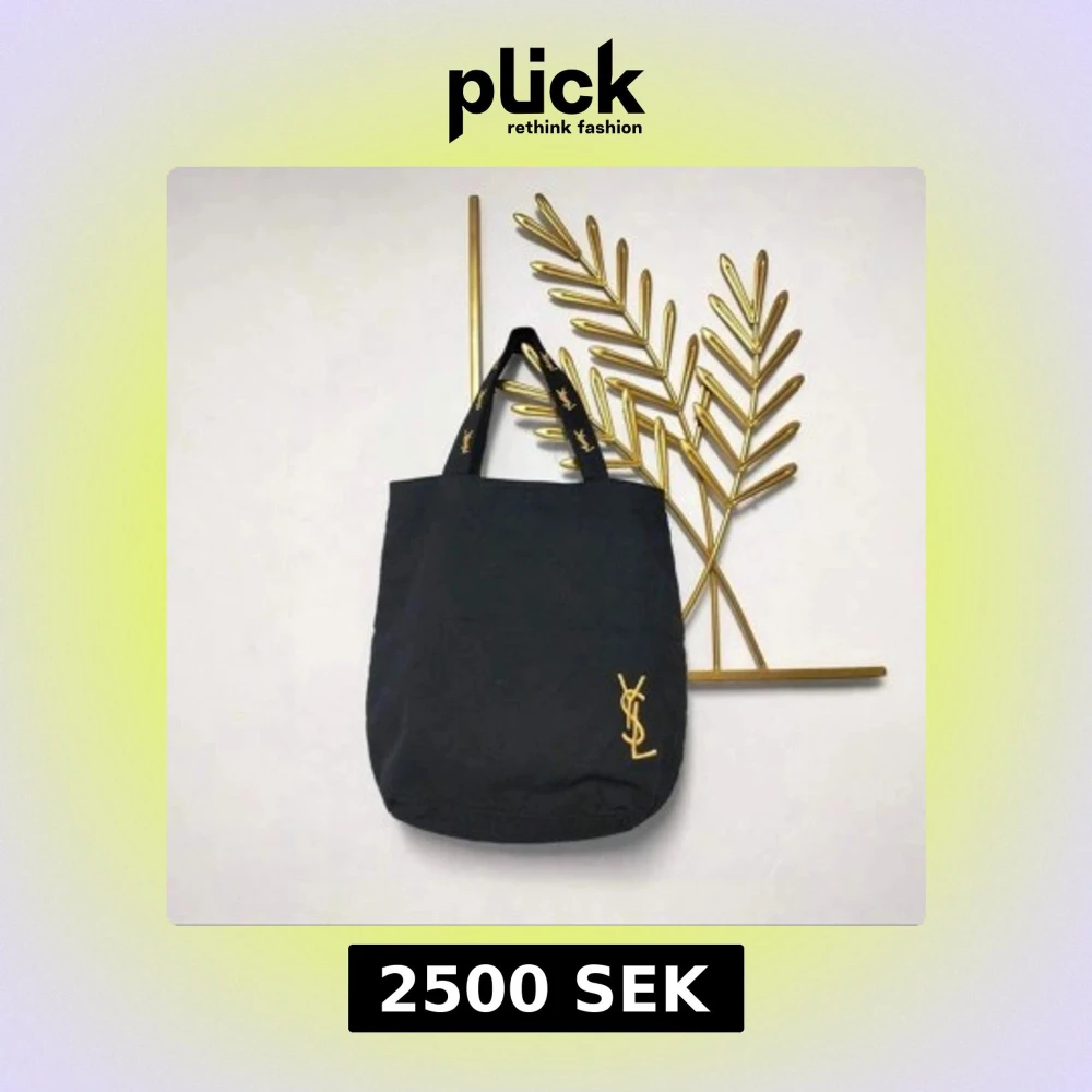 Stilren svart shoppingväska från YSL med klassisk gul broderad logga på framsidan och matchande detaljer på handtagen. Väskan är rymlig och har en mjuk, rundad form. Perfekt för dig som vill ha en snygg och praktisk väska med lyxig känsla.
