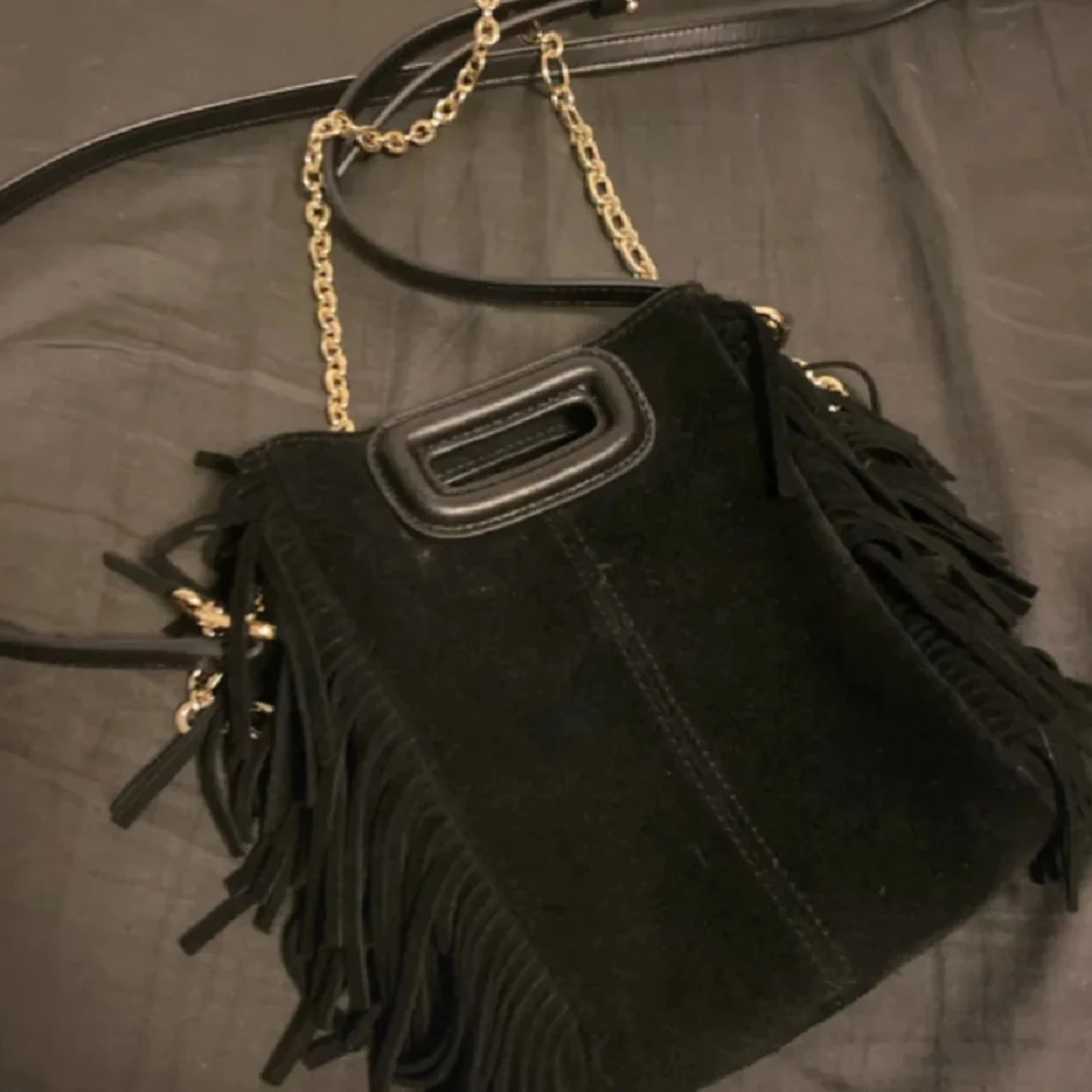 Cool svart axelväska i mocka med fransar på sidorna och silverfärgade nitar framtill. Väskan har axelrem i läderimitation samt ett praktiskt handtag upptill. Perfekt för dig som vill sticka ut med detaljer och edgy stil. (EJ GULDKEDJA) hör av för mer frågor 💕