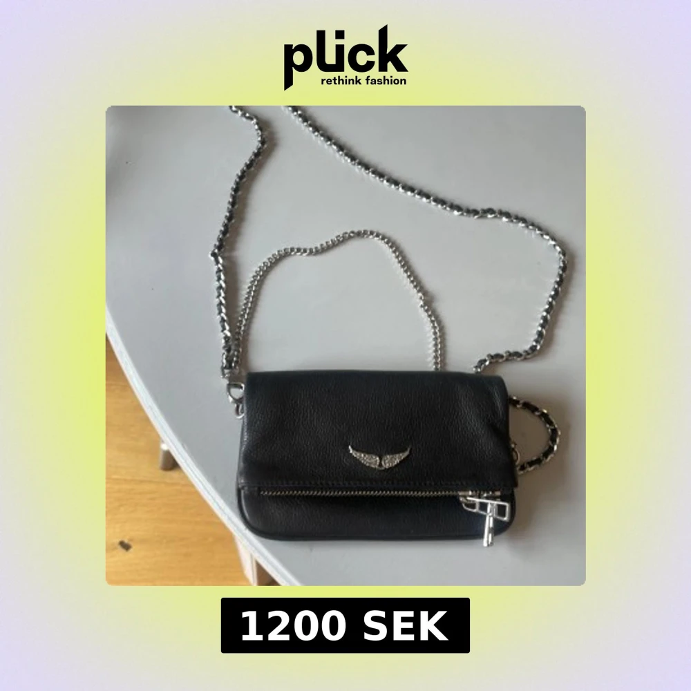 Snygg svart axelväska i skinn med en cool kedja som axelrem. Väskan har en dragkedja framtill och en dekorativ metallvinge. Perfekt för att ge din outfit en edgy touch.
