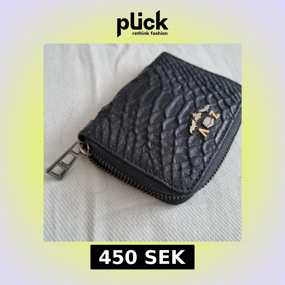 Snygg svart plånbok med dragkedja och textur som liknar reptilmönster. Den har en metallisk ZV logotyp på framsidan och flera fack inuti för kort och kontanter. Perfekt för att hålla dina saker organiserade och säkra.