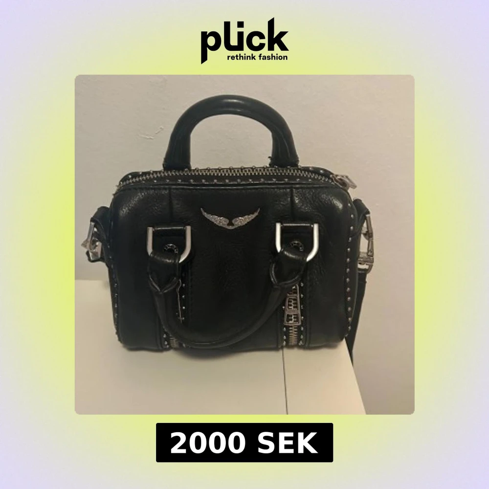 Snygg svart handväska i skinn från Zadig & Voltaire med coola detaljer. Väskan har en justerbar axelrem med texten 'VOLTAIRE'. Perfekt som festväska men även till vardags. Får plats med dom viktigaste sakerna man behöver ha med sig. Köptes 2022 för 3300kr från Zadig & Voltaires hemsida. Den är i fint skick men inte använd på ett tag så vill att den ska få mer användning hos någon annan.