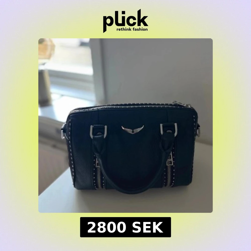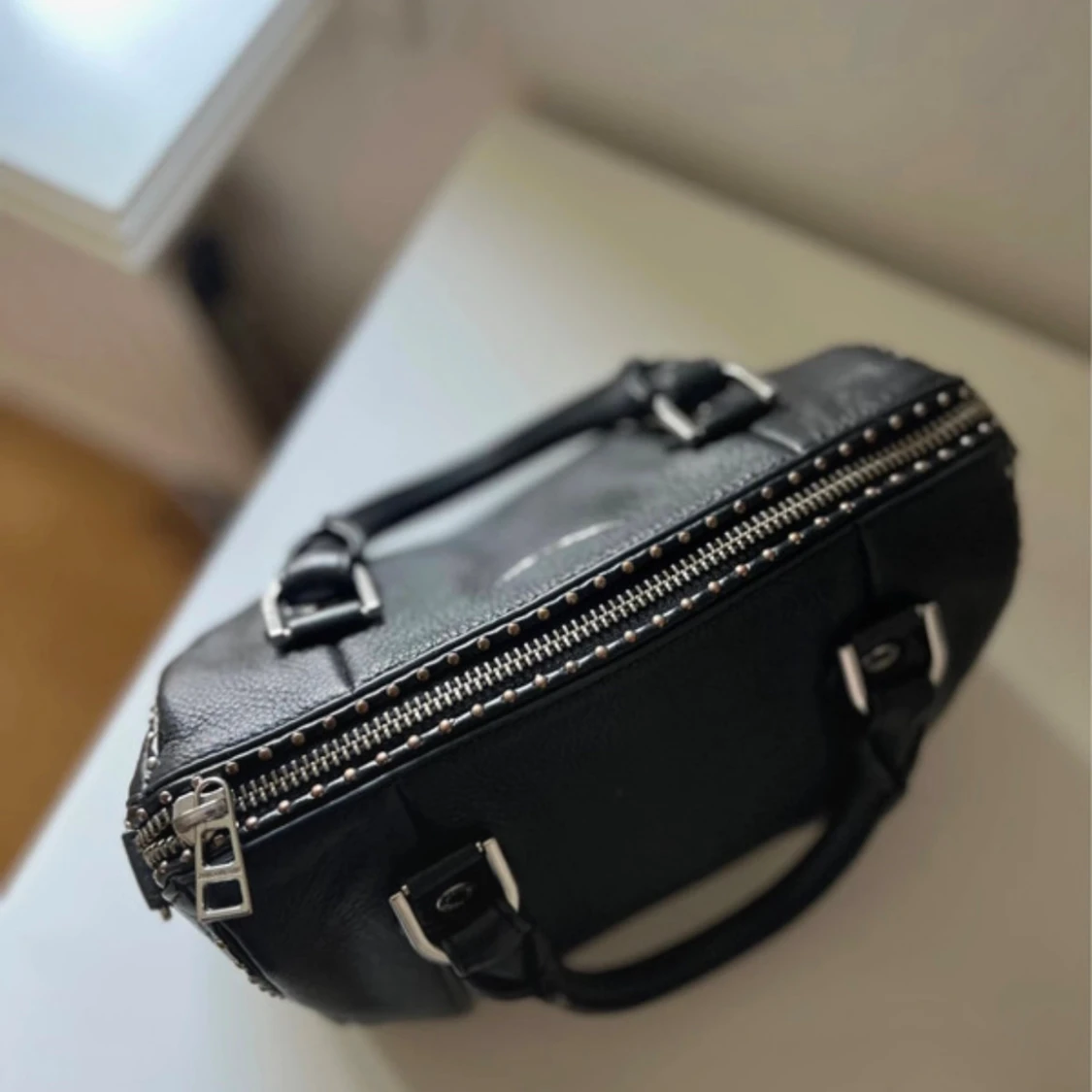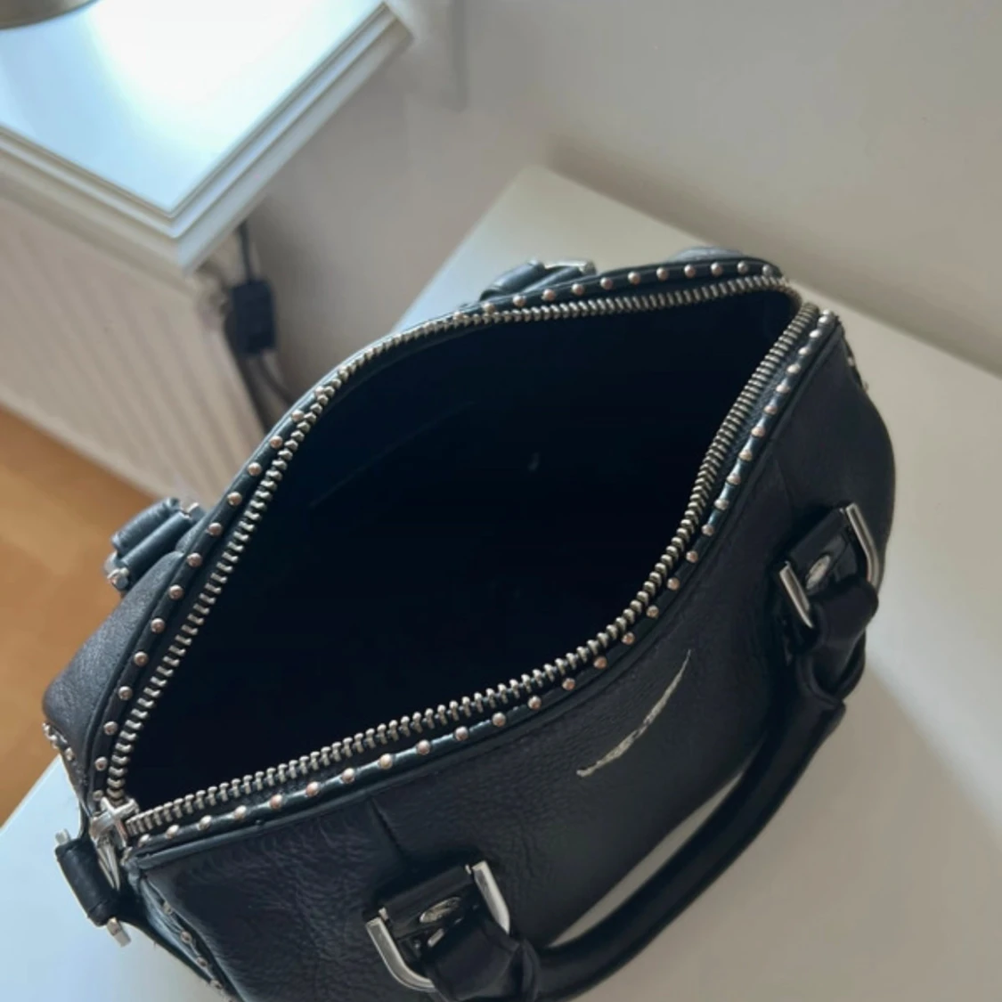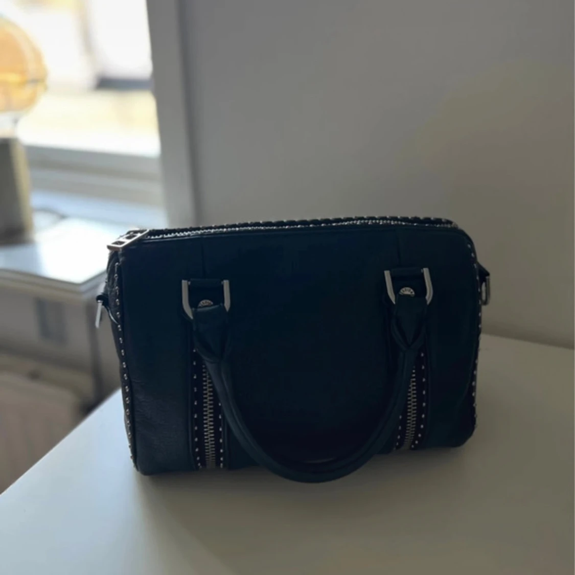 Cool svart handväska från Rebecca Minkoff i skinn med silverfärgade detaljer, nitar längs kanterna och dubbla dragkedjor framtill. Väskan har två rejäla handtag och ett stilrent emblem i metall på framsidan. Perfekt storlek för det viktigaste.