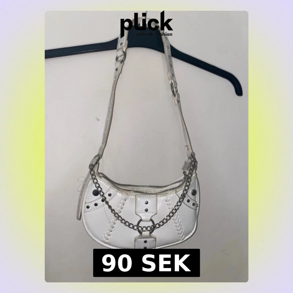 ” smuts färgen” är köpt så. Cool vit axelväska i skinnimitation med silvriga kedjor och nitar. Väskan har dekorativa sömmar, dragkedja upptill och justerbart axelband med metallringar. Perfekt för dig som gillar edgy och trendiga accessoarer.