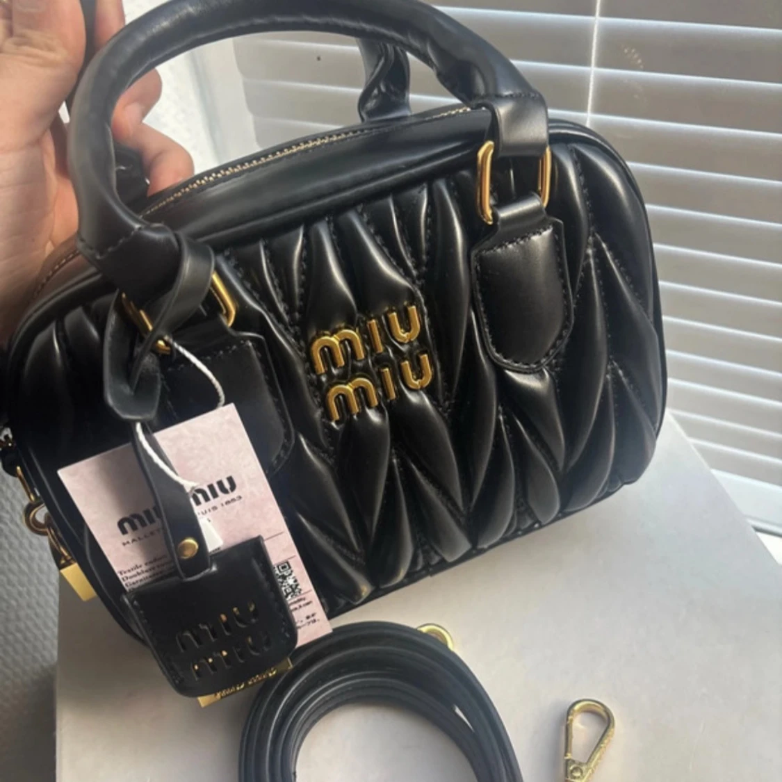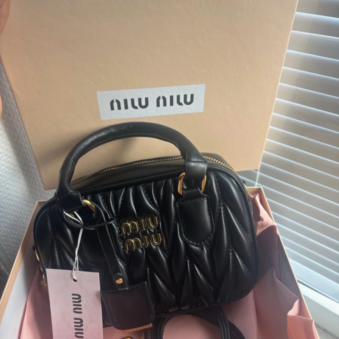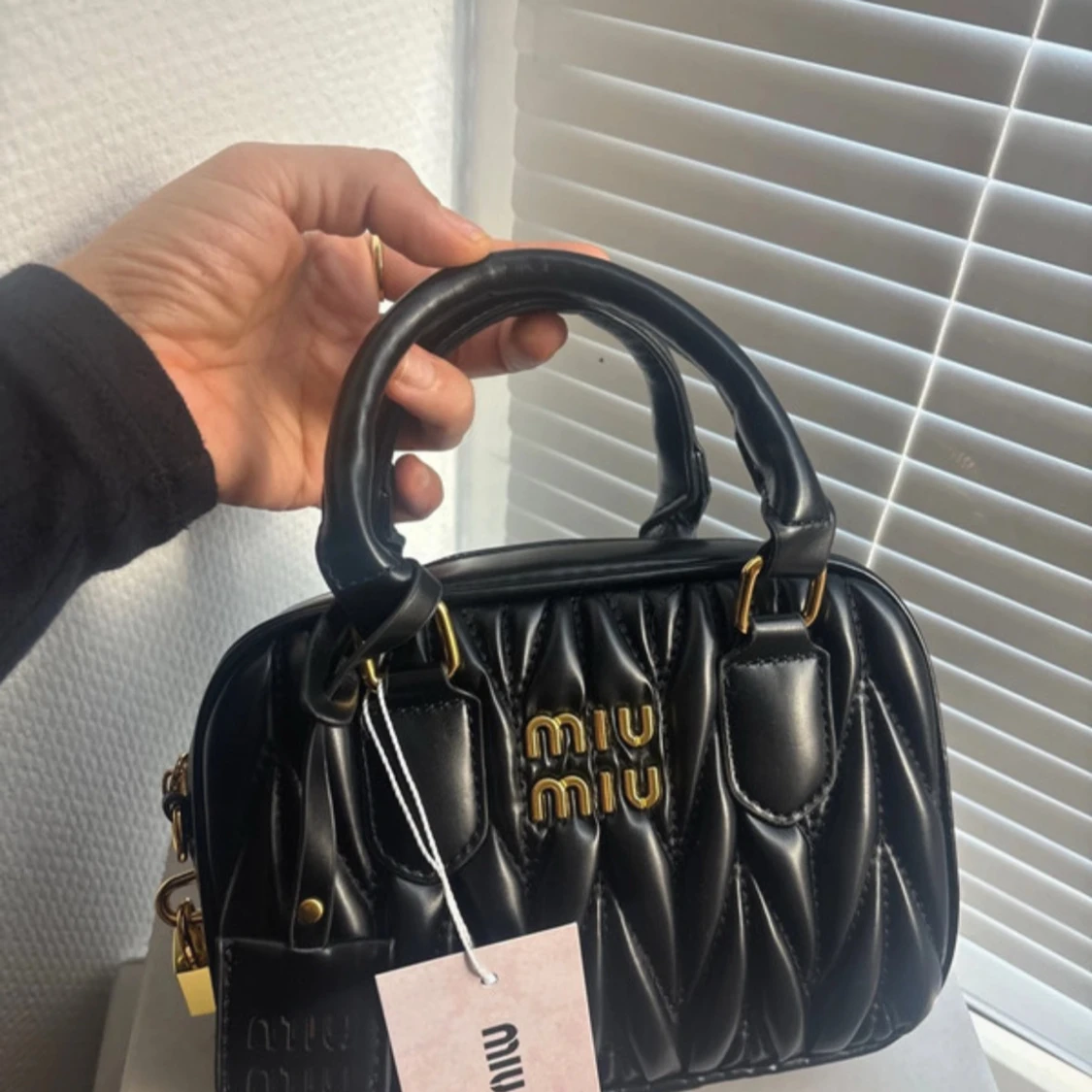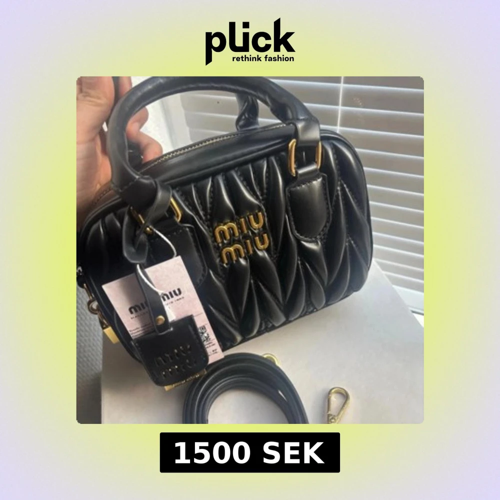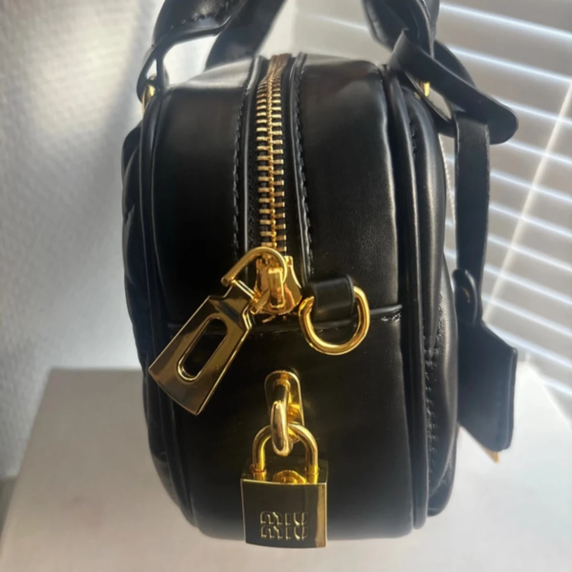Supersnygg svart quiltad handväska från Miu Miu med guldiga detaljer och logotyp framtill. Väskan är i skinn och har både handtag och avtagbar axelrem. Stängs med dragkedja och har ett hänglås med Miu Miu-logga. Perfekt för dig som vill ha en lyxig och trendig accessoar.
