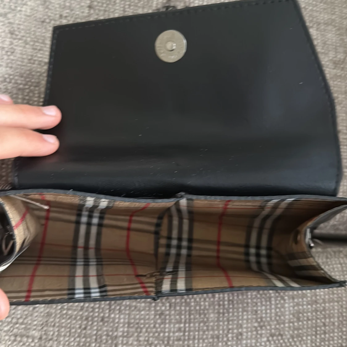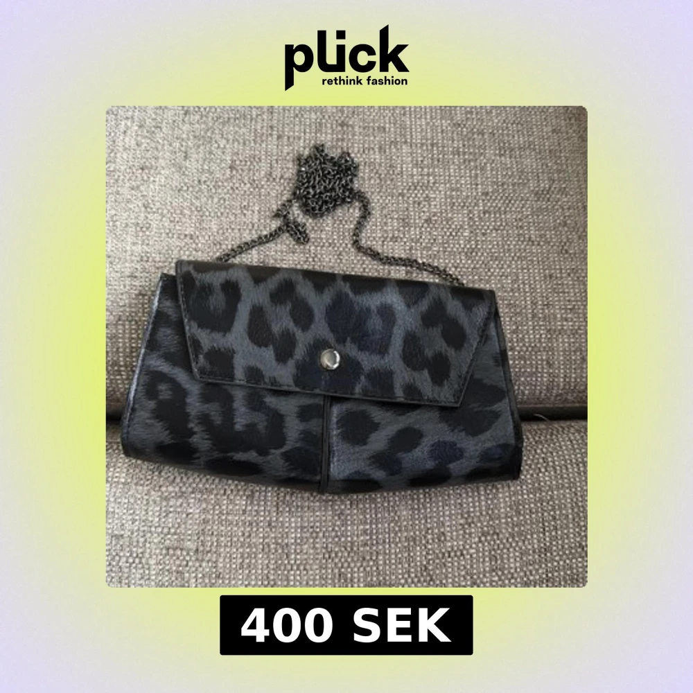 Snygg svart kuvertväska med leopardmönster och silverfärgad kedja. Väskan har magnetlås och insidan är fodrad med klassiskt rutigt tyg. Bara att skriva vid frågor och priset kan såklart diskuteras!