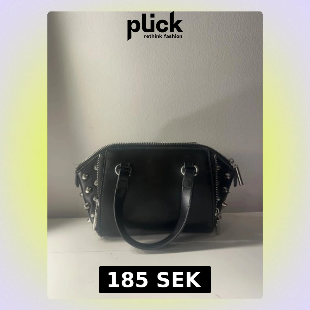 Cool svart handväska i skinn med silverfärgade nitar på sidorna och dubbla dragkedjor upptill. Väskan har två handtag och en rymlig insida med fack. Alla bitar e kvar förutom 1 på sidan (se sista bilden)💓
