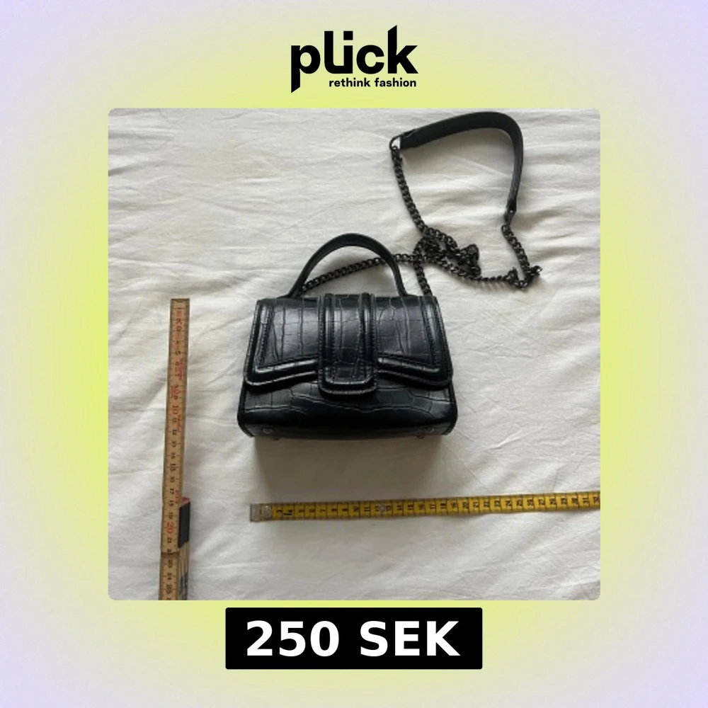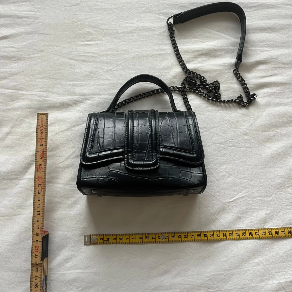 Snygg svart axelväska med krokopräglat mönster och kedjerem. Väskan har ett dekorativt spänne framtill och ett litet handtag upptill. Perfekt för att bära det viktigaste och ger en cool touch till outfiten.