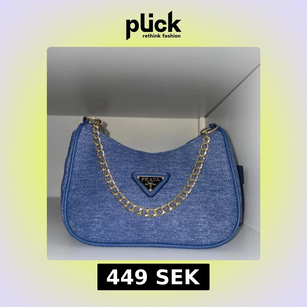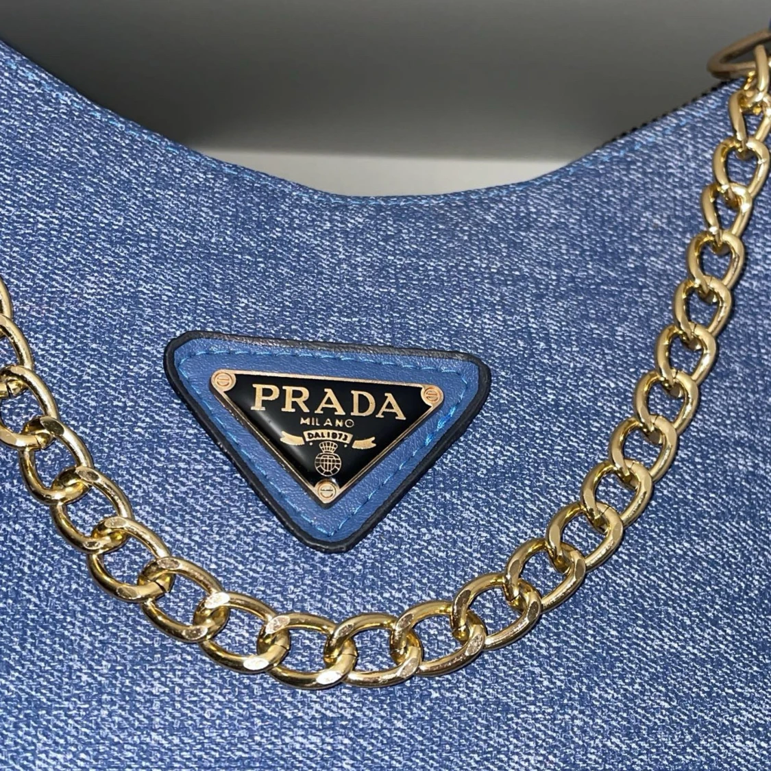 Snygg blå axelväska i denim-look med guldfärgad kedja och klassisk trekantig logga framtill. Väskan har en mjuk, rundad form och detaljer i blått läder. Perfekt för dig som vill ha en trendig och lyxig accessoar.