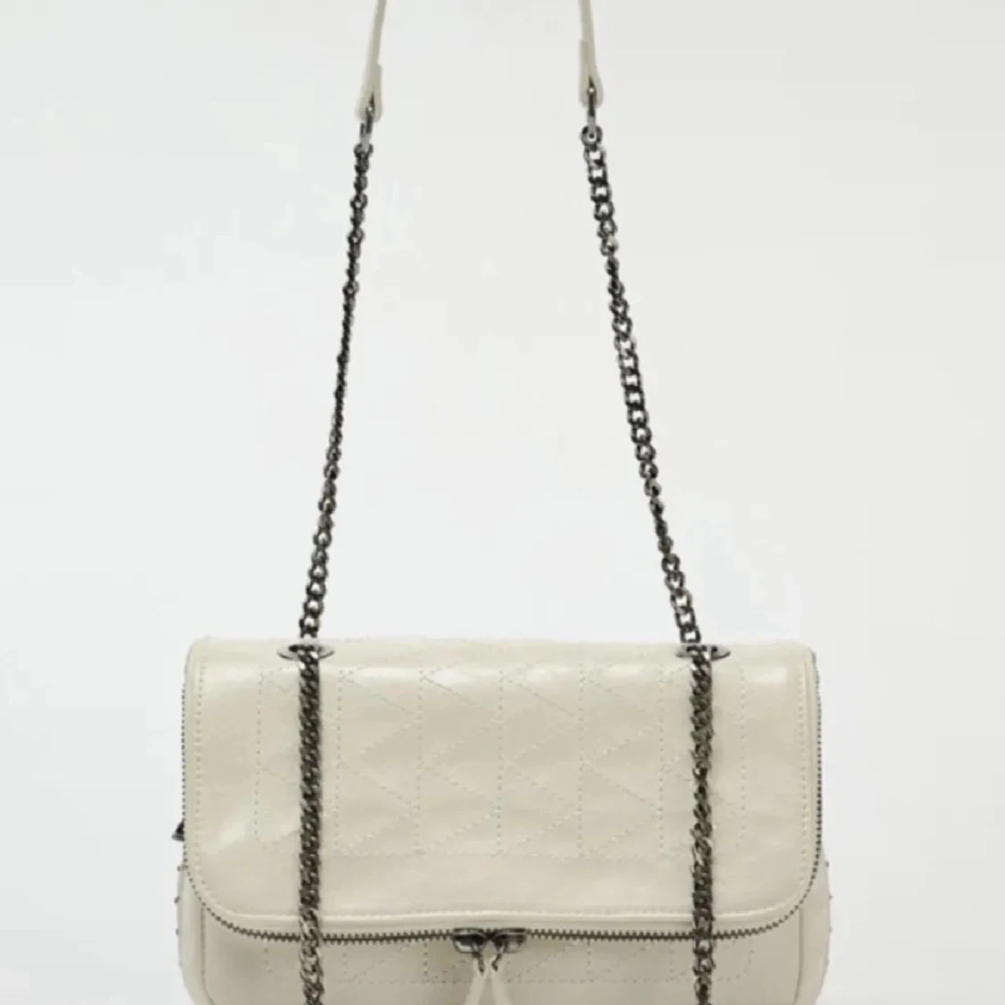 Elegant beige axelväska med quiltad design och kedjeaxelrem. Väskan har en stilren look med dragkedjedetalj framtill. Köptes förra sommaren men knappt blivit använd. Jätte fint skick, köpt på Zara.