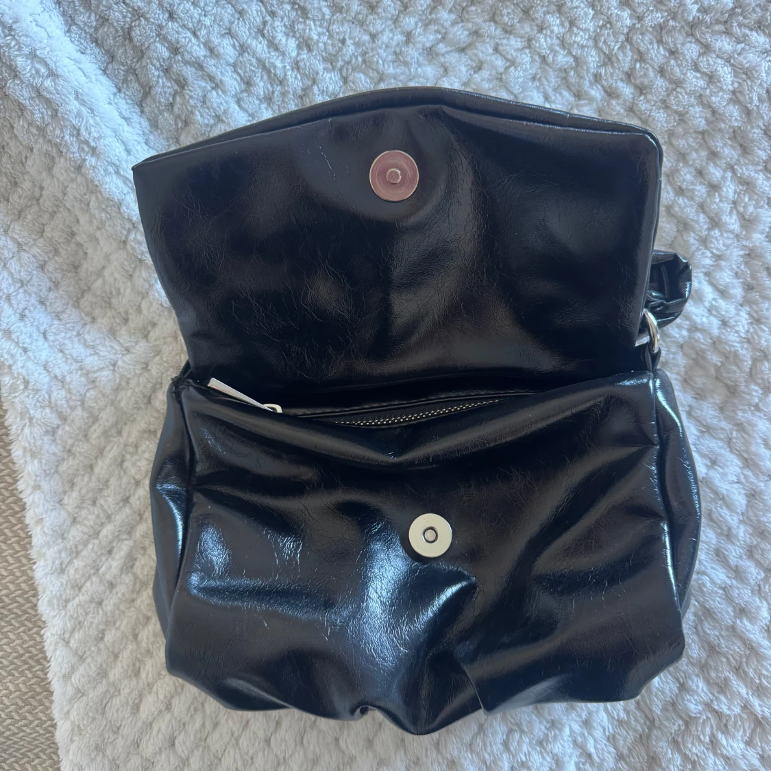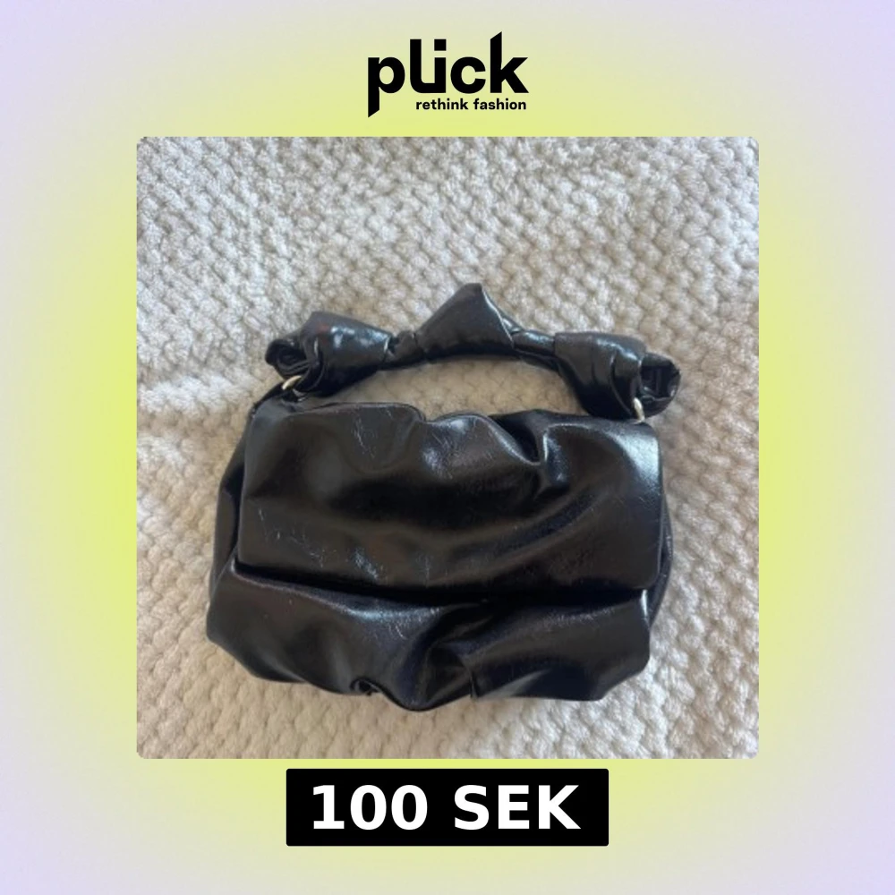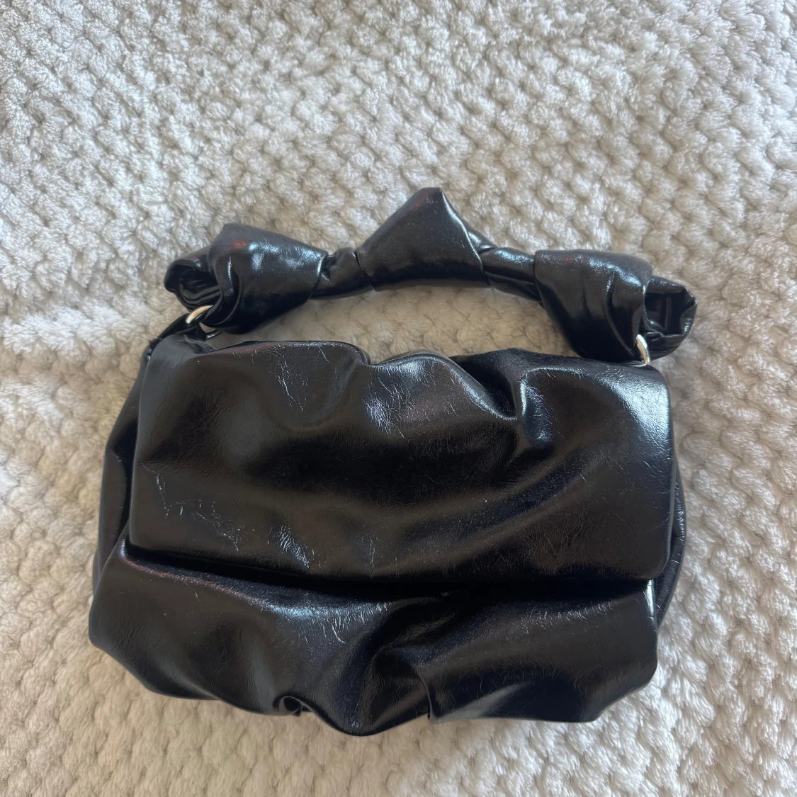 Cool svart handväska i glansigt skinnimitation med unik knutdetalj på handtaget.
