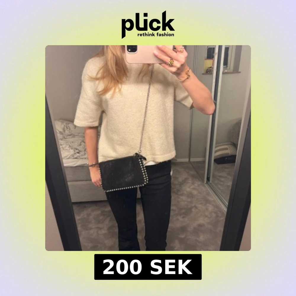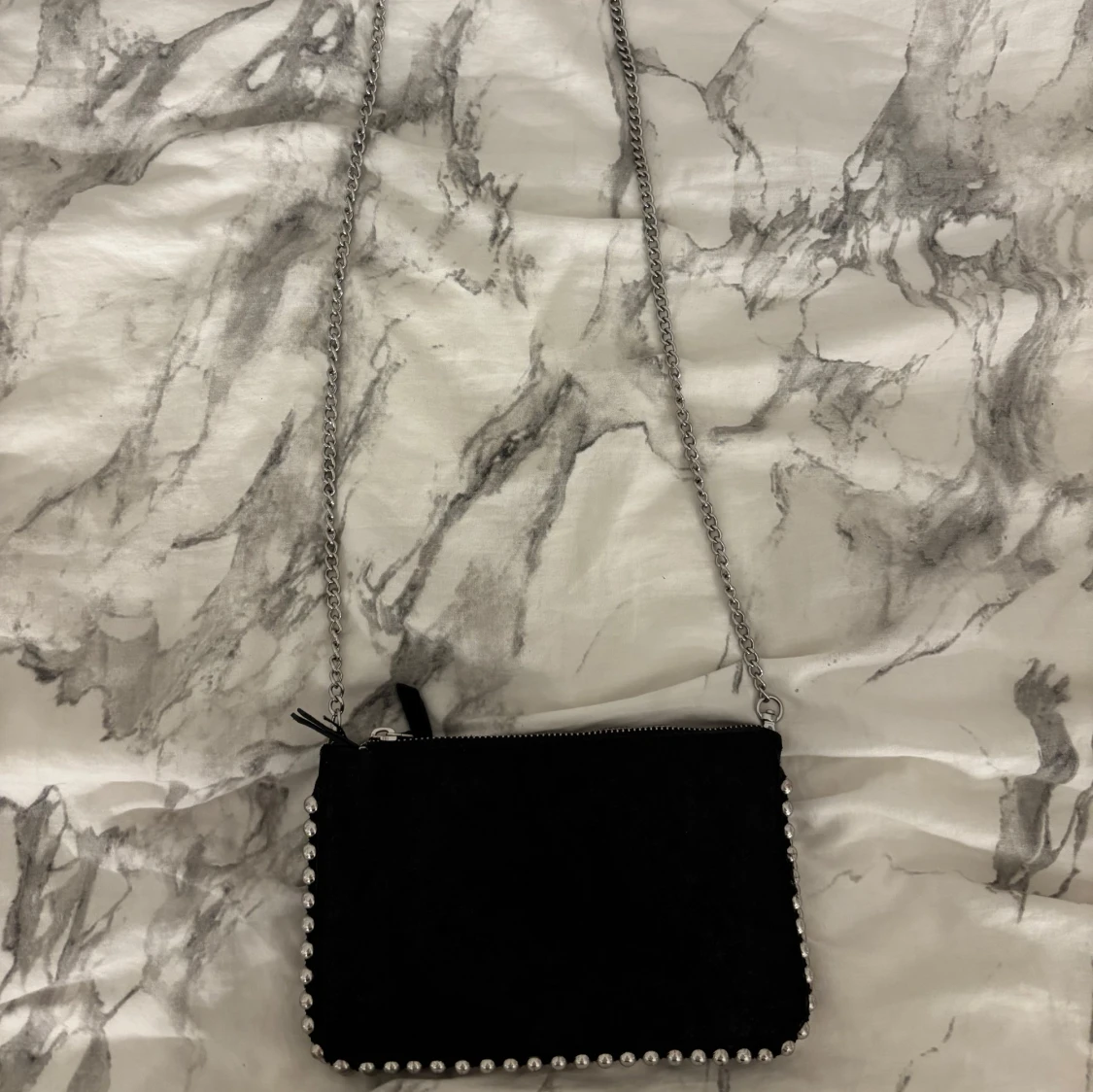 Snygg svart axelväska med silverkedja. Inga tydliga defekter, ”pärlorna” har lite skav på sig men inget man knappt ser eller tänker på.