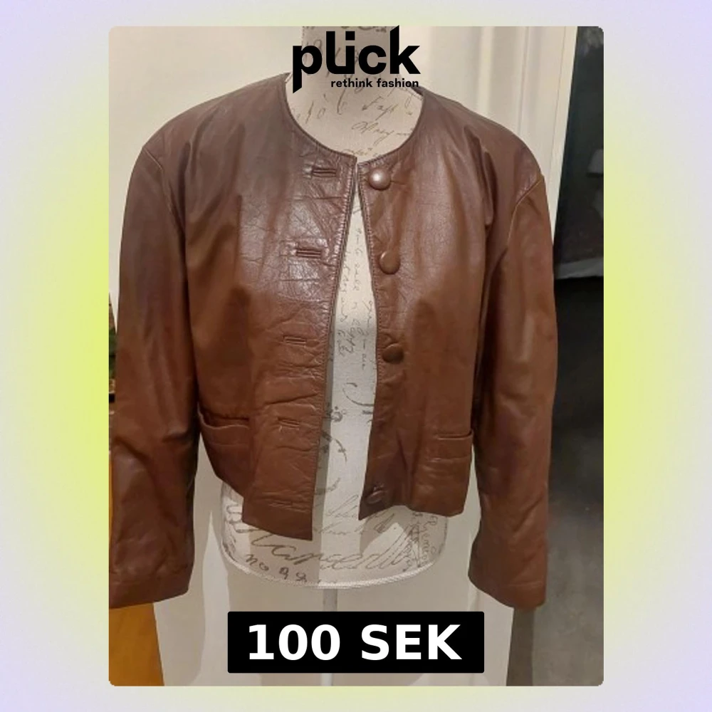Snygg brun skinnjacka i kort modell med rund halsringning och stora knappar framtill. Jackan har två fickor och raka ärmar, 1 knapp har lossnat men ligger i fickan.