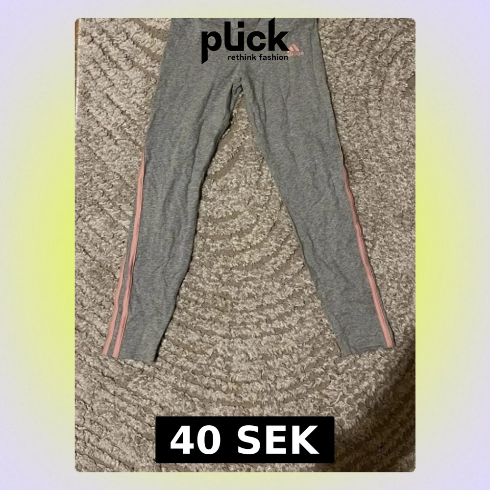 Grå leggings från Adidas med rosa ränder längs sidorna och Adidas-logga framtill. Tight passform och mjukt material som passar perfekt till träning eller chill. Klassisk sportig look med snygga detaljer.